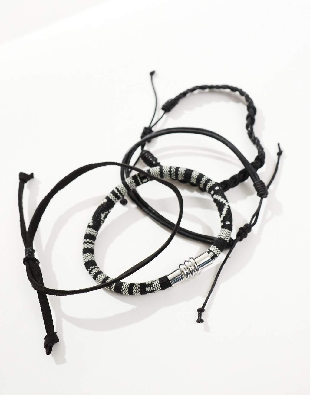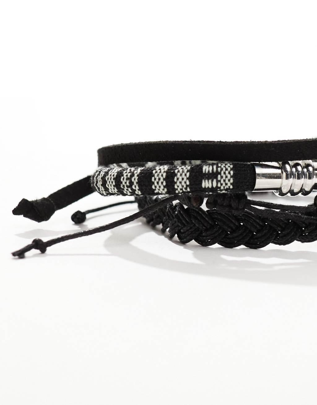 ASOS DESIGN 4 pack leather and woven bracelet in monochrome