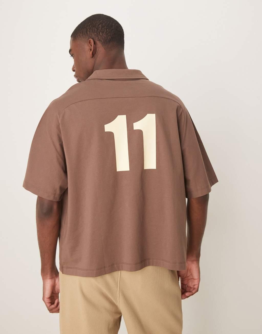 ASOS DESIGN boxy oversized polo with sports graphic in brown