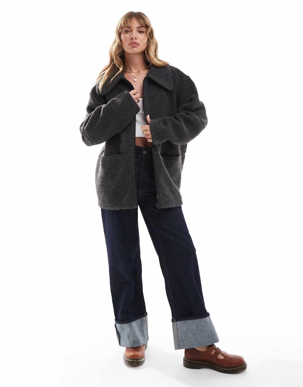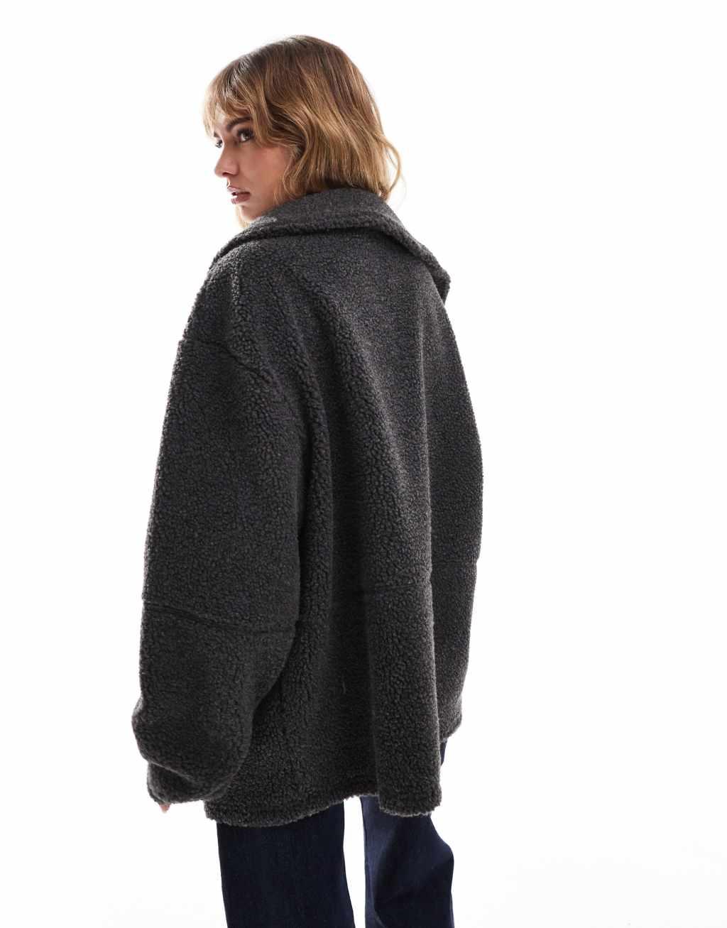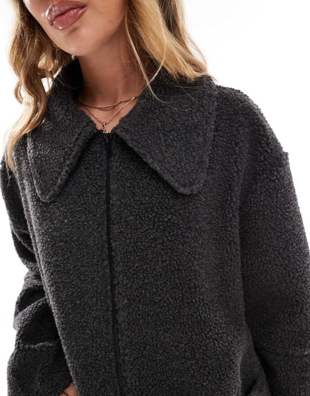 ASOS DESIGN collared teddy fleece zip up sweatshirt in charcoal