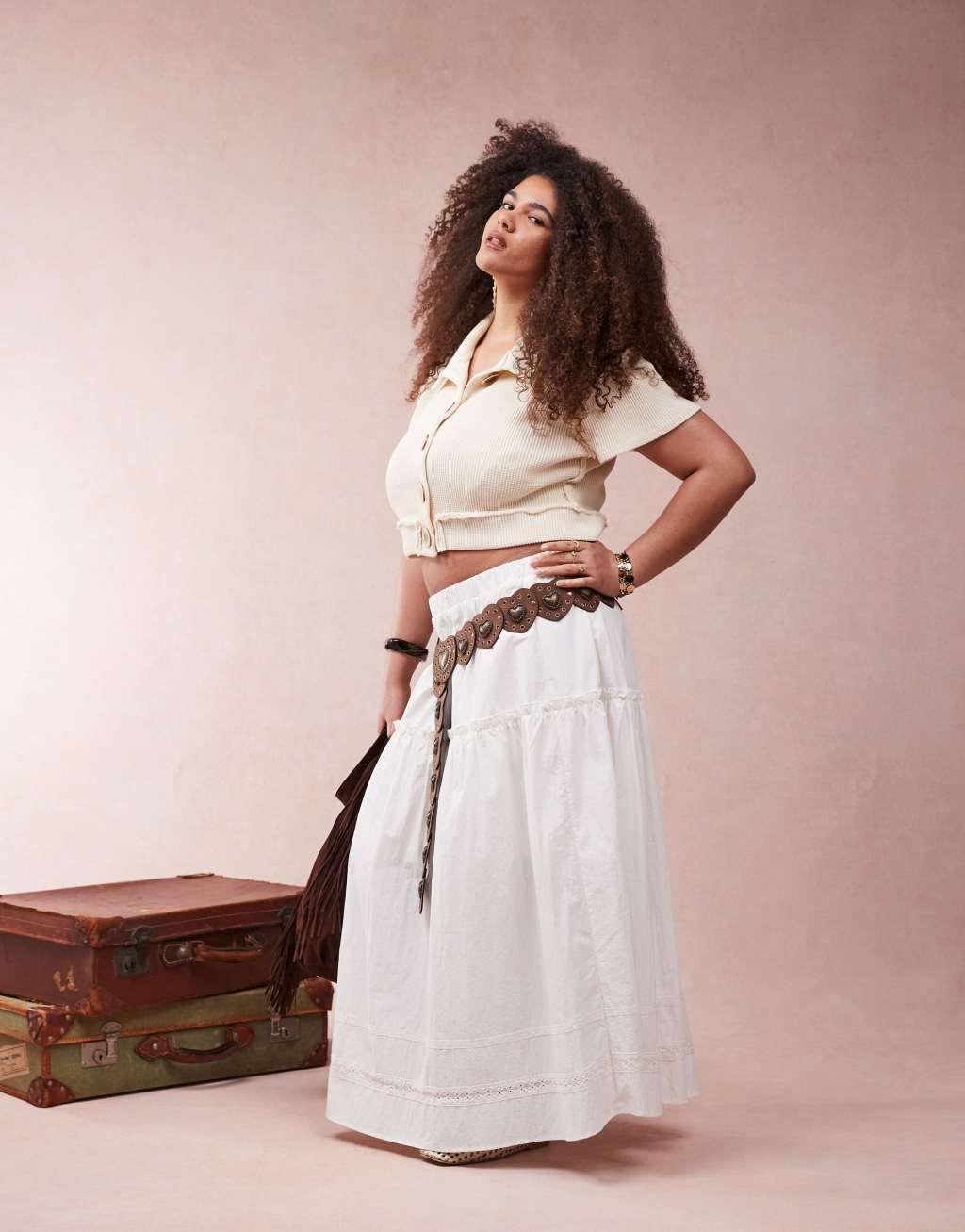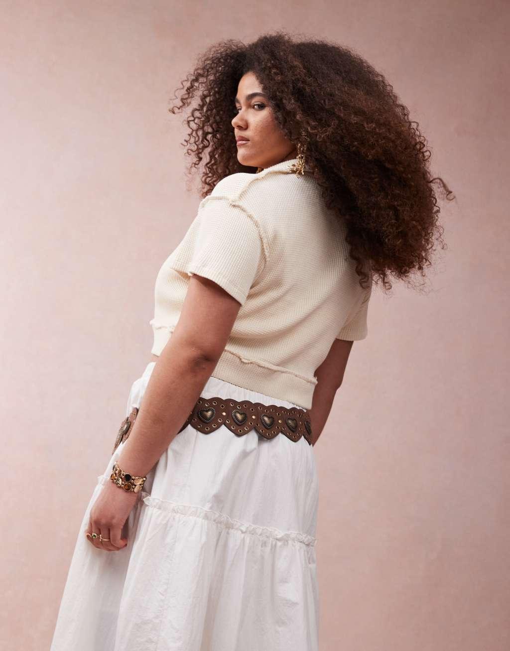 ASOS DESIGN CURVE faux suede studded heart disc detail waist and hip belt in brown