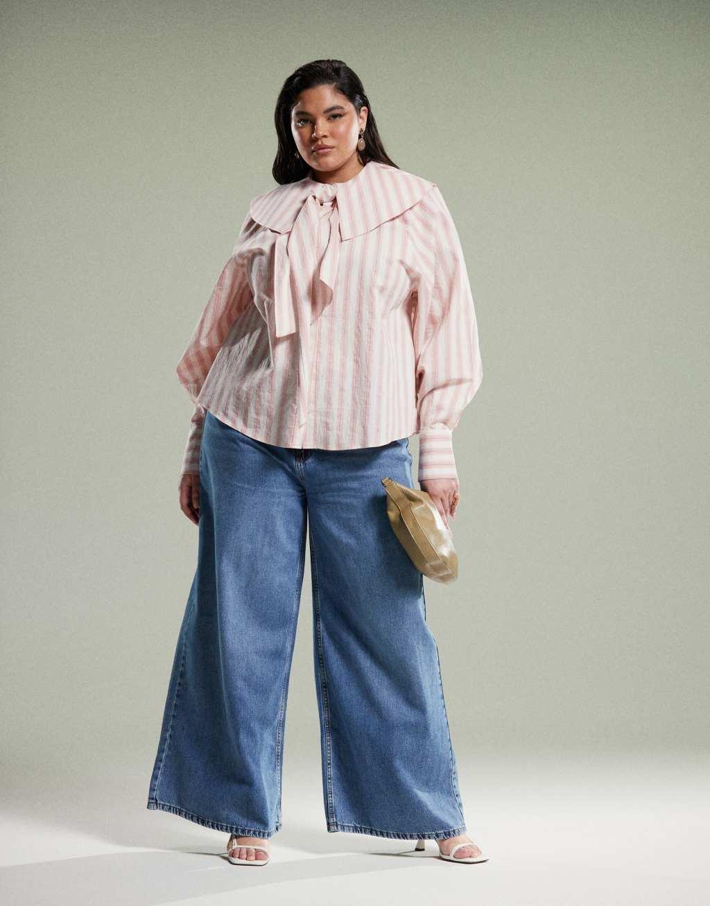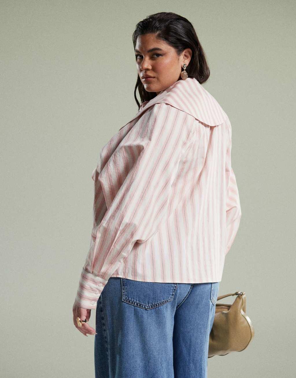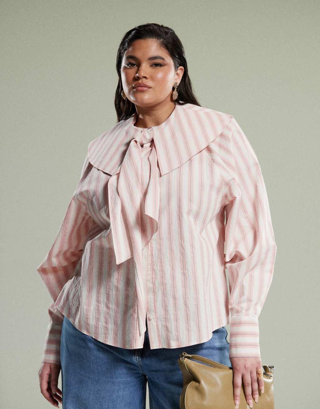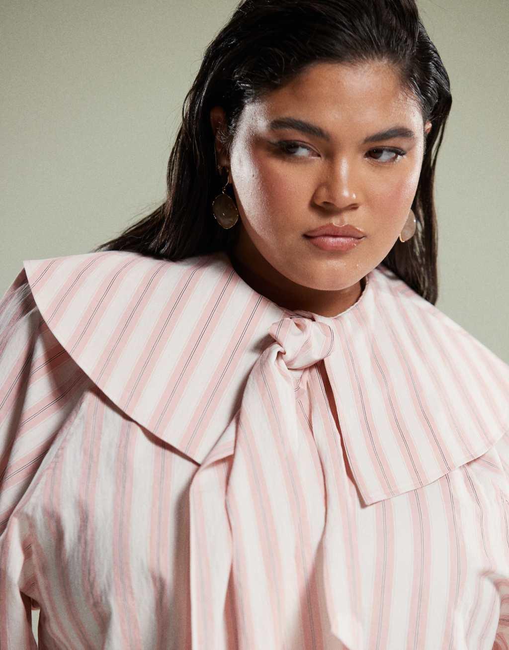 ASOS DESIGN Curve shirt with large collar and tie detail in pink stripe