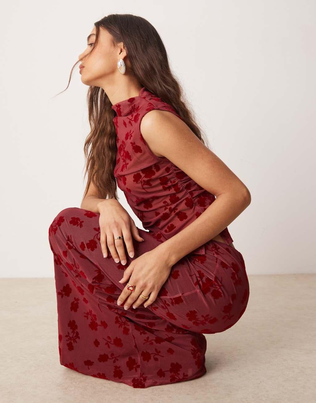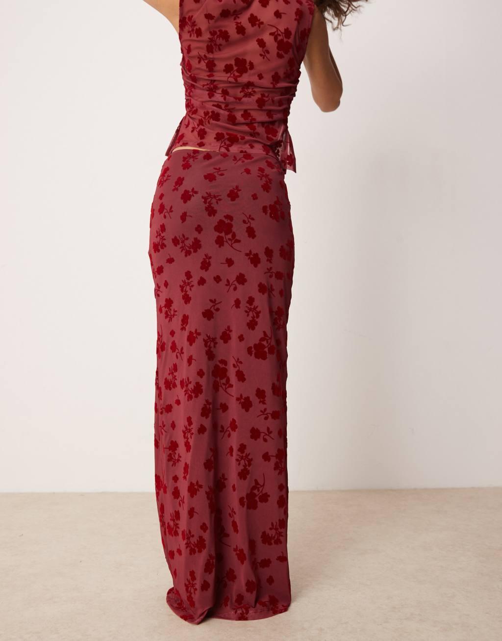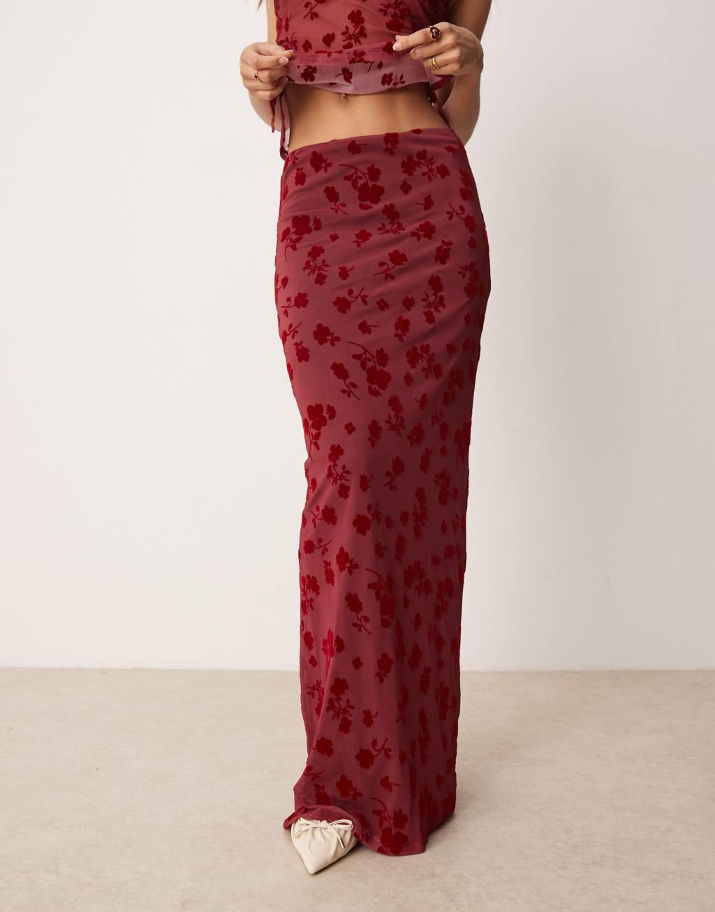 ASOS DESIGN flocked mesh low rise maxi skirt in red - part of a set