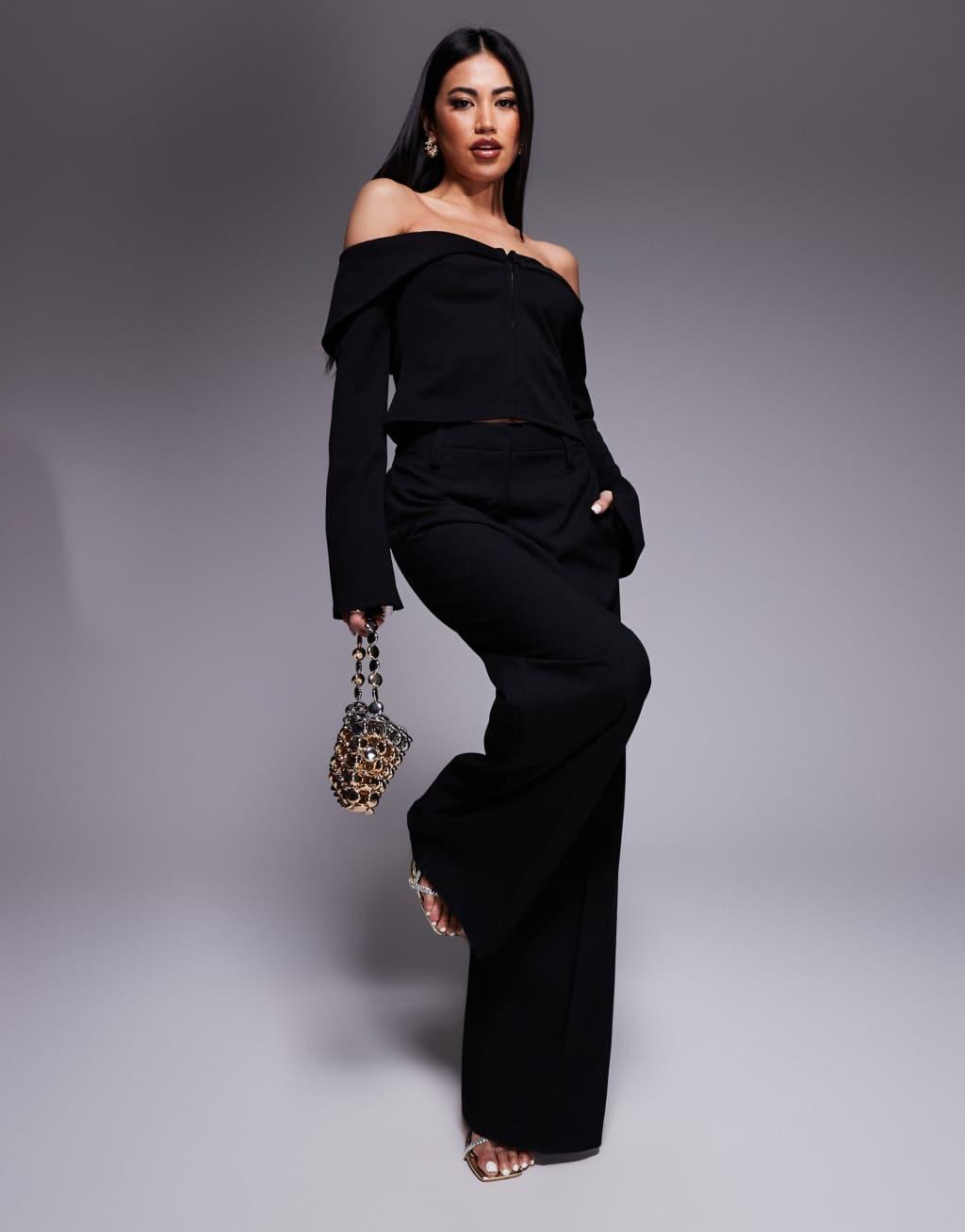 ASOS DESIGN fold over structured bardot top with hook and eye front in black