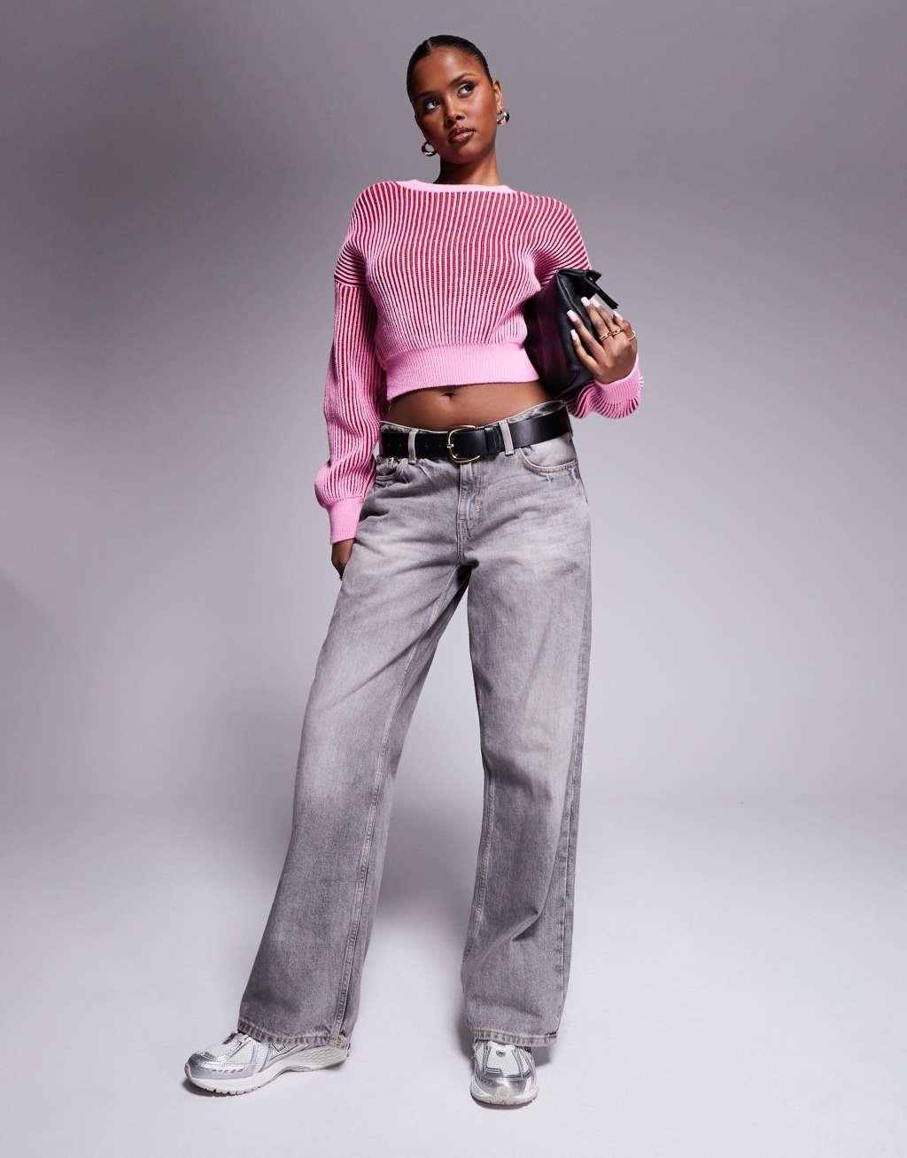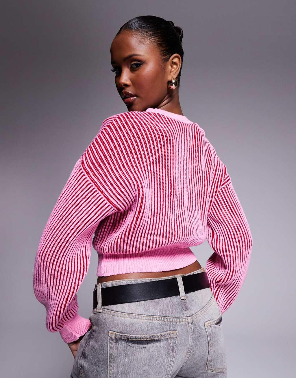 ASOS DESIGN knit crew neck plated sweater with ribbed hem detail in pink