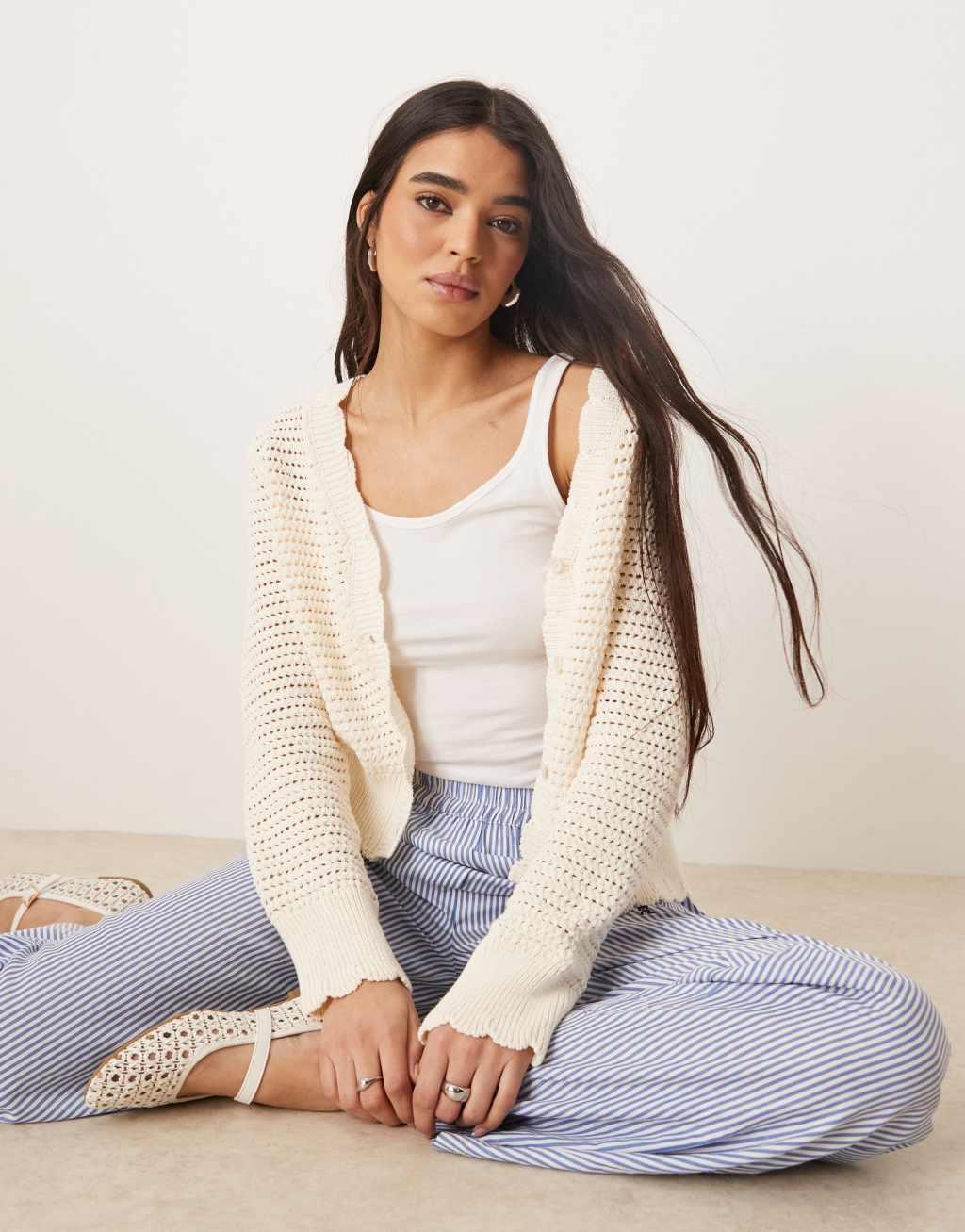 ASOS DESIGN knit crochet look cardigan with scalloped edge in ecru