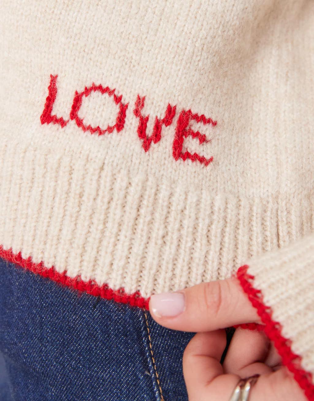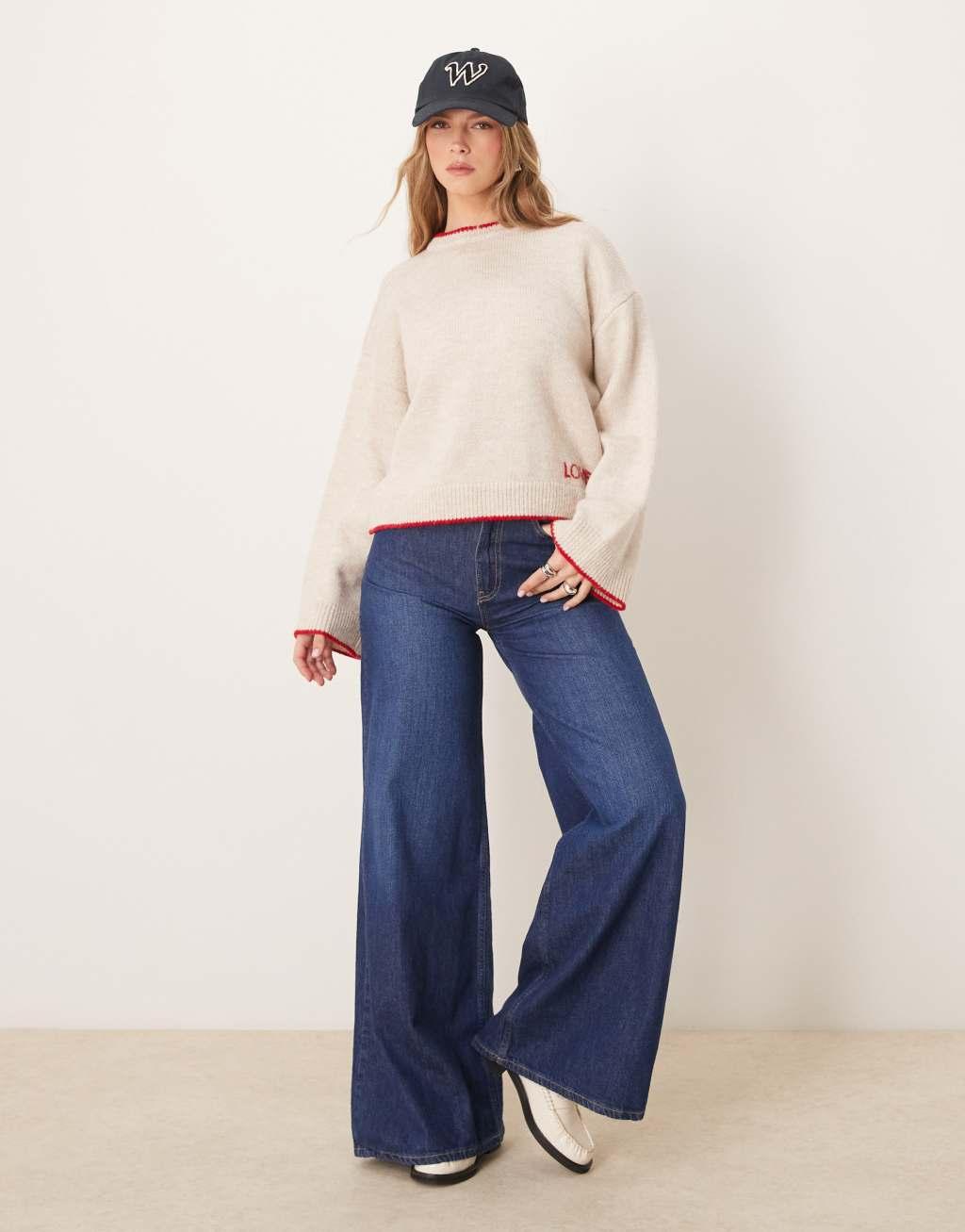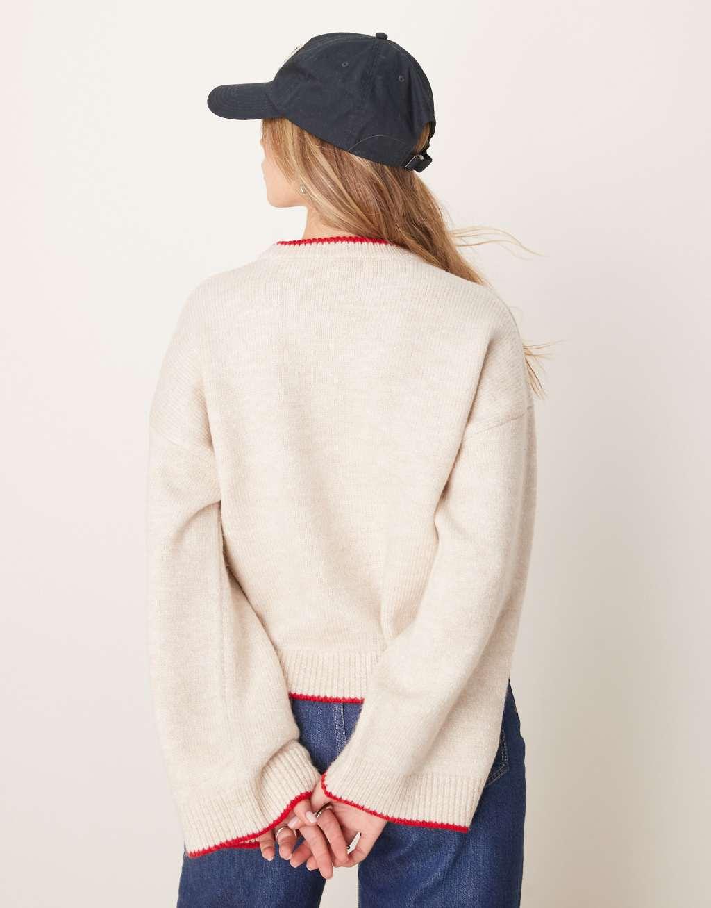 ASOS DESIGN knit sweater with contrast blanket stitch and embroidery in ecru
