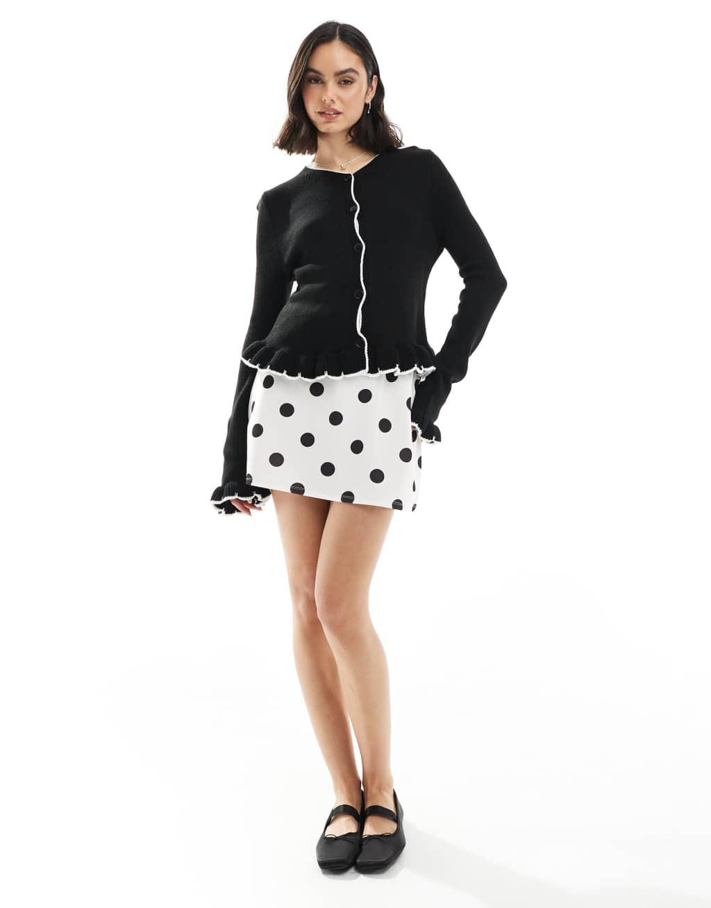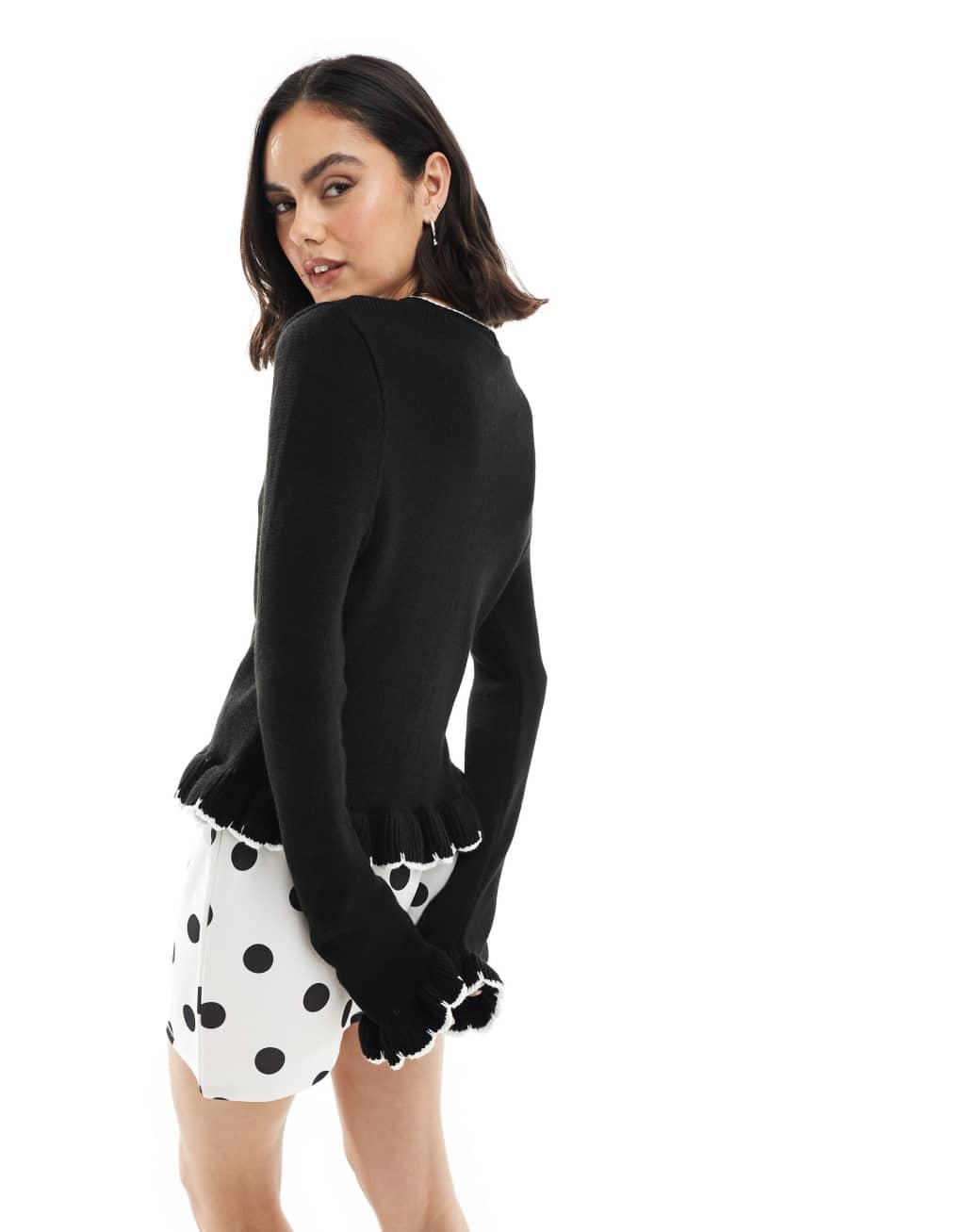 ASOS DESIGN knitted crew neck blanket stitch cardigan with frill detail in black