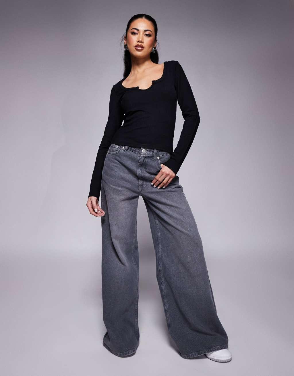 ASOS DESIGN long sleeve ribbed top with notch detail in black