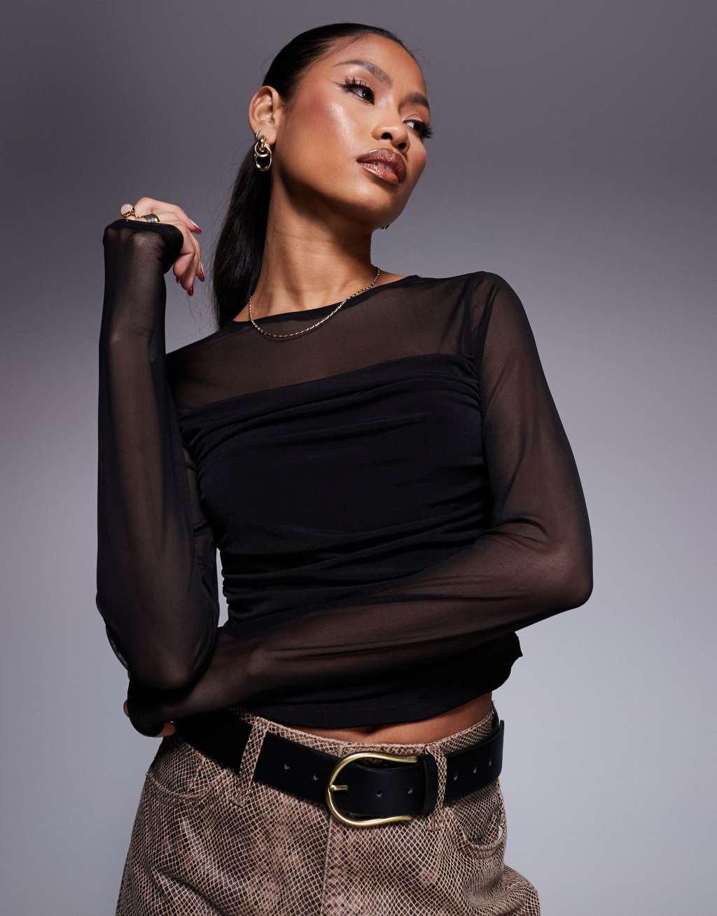 ASOS DESIGN mesh draped front long sleeve top in black