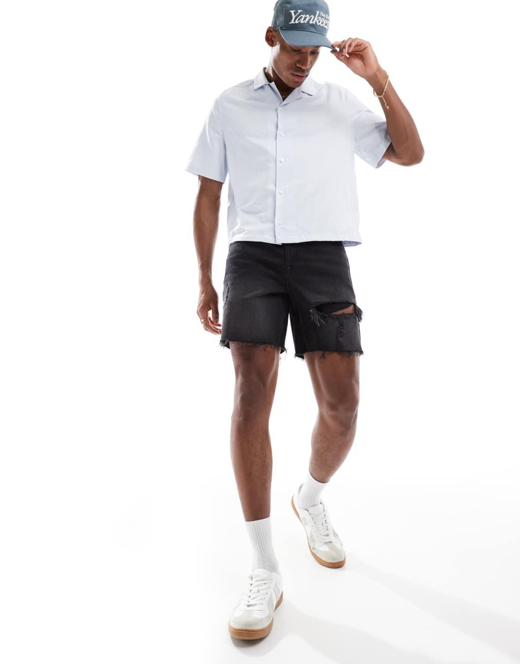ASOS DESIGN mid length slim denim shorts with rips in wash black