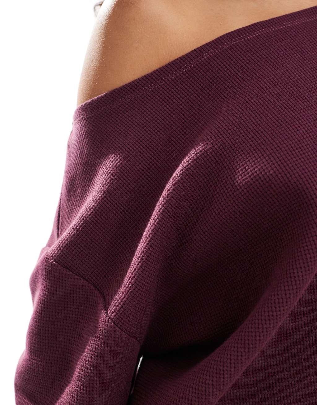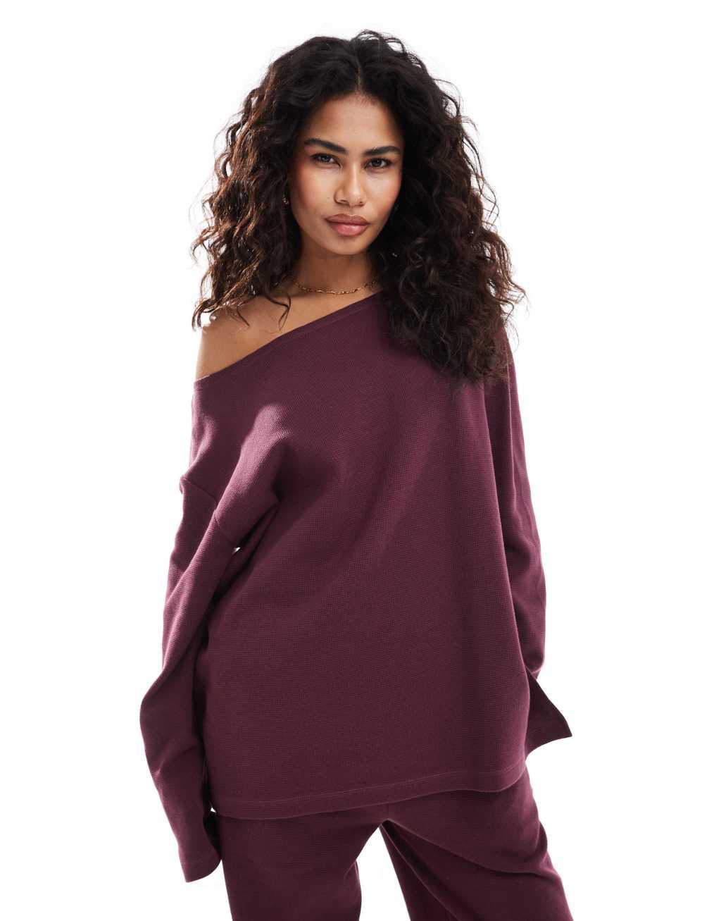 ASOS DESIGN oversized off the shoulder waffle knit top in burgundy - part of a set