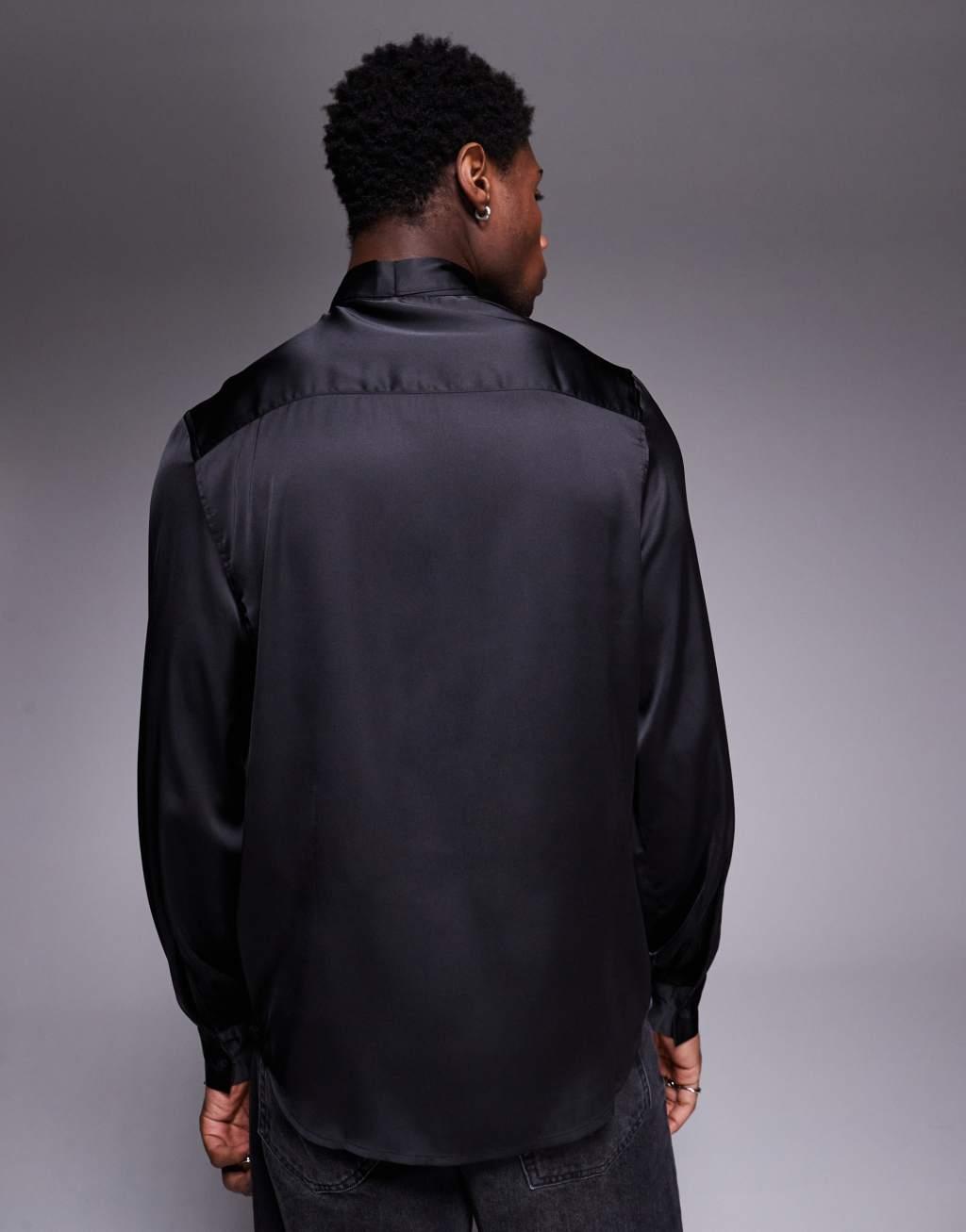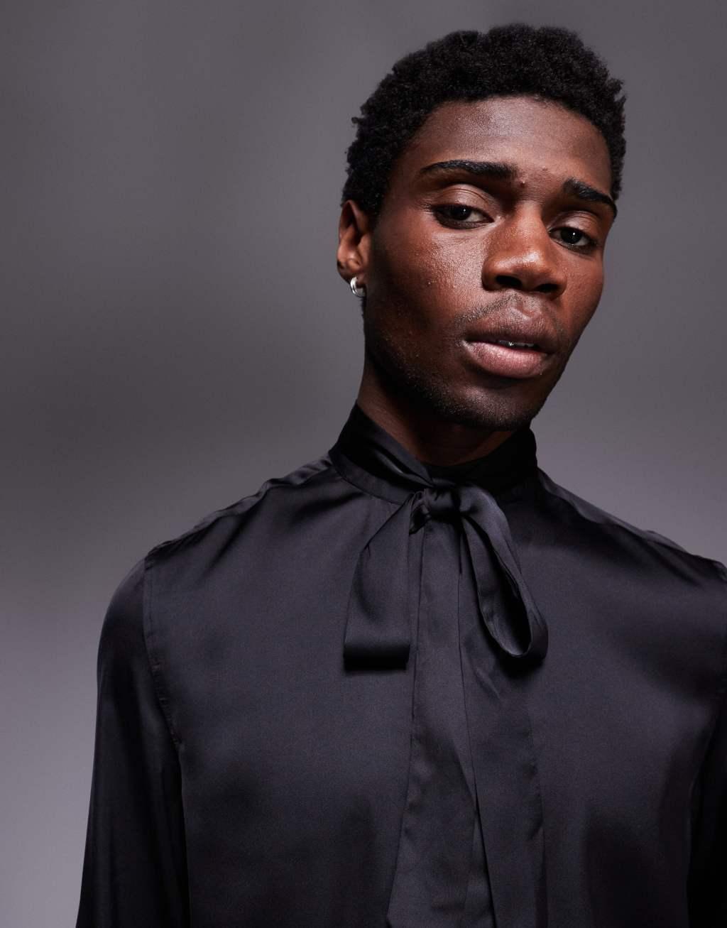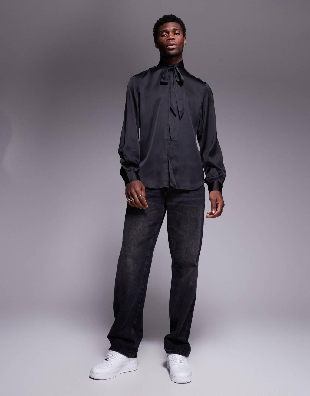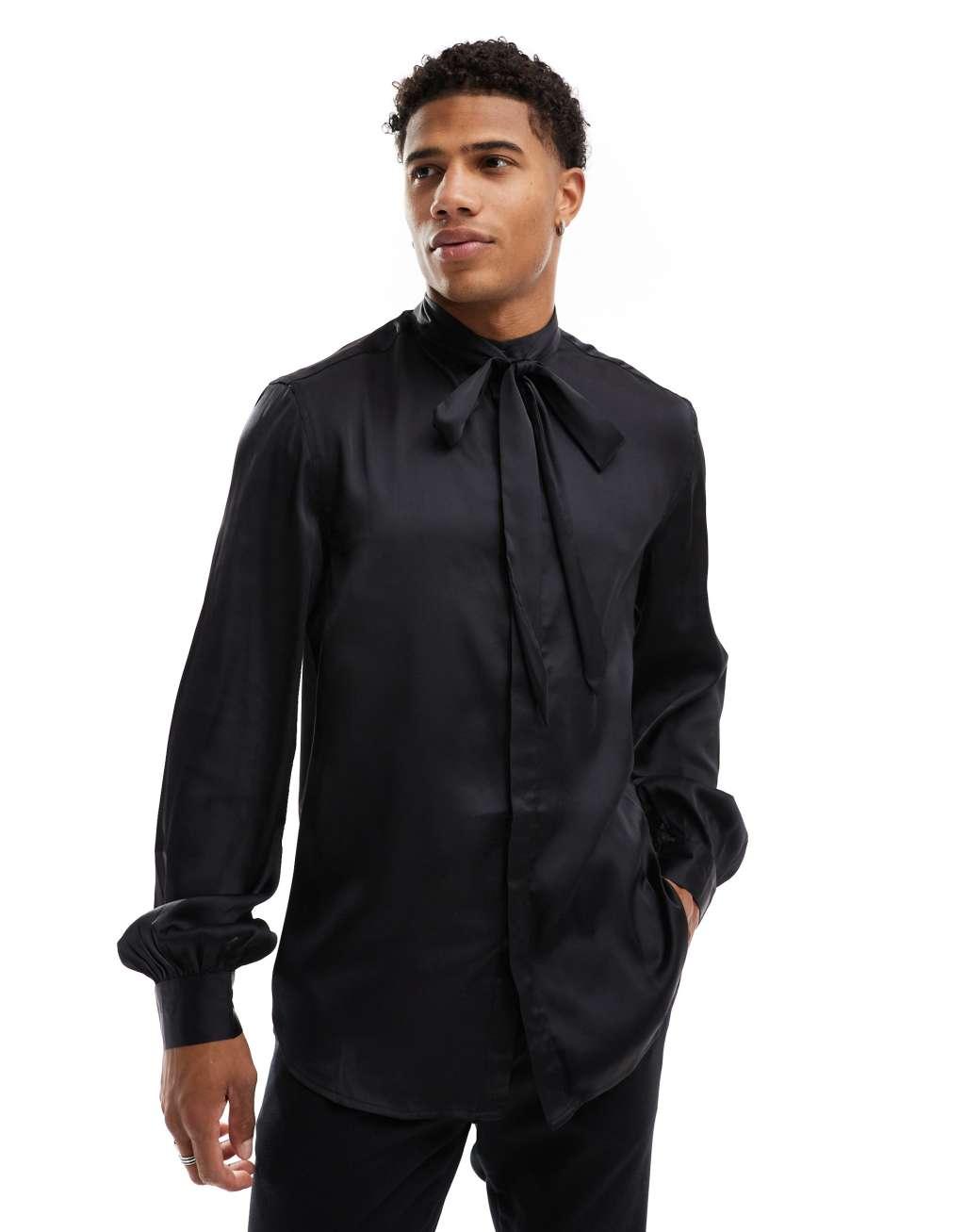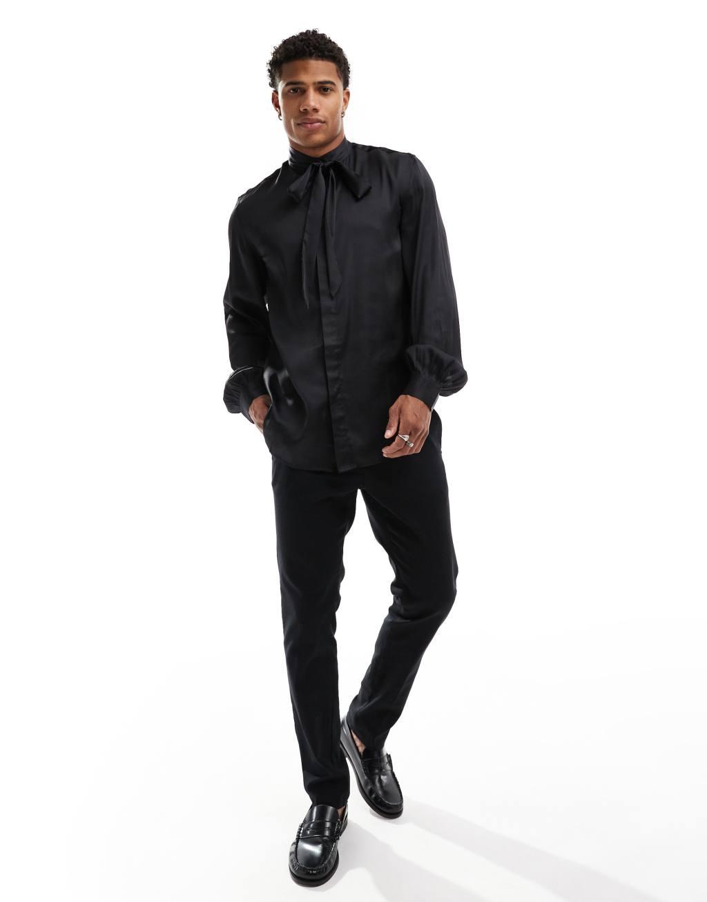 ASOS DESIGN satin regular shirt with tie neck and blouson volume sleeve