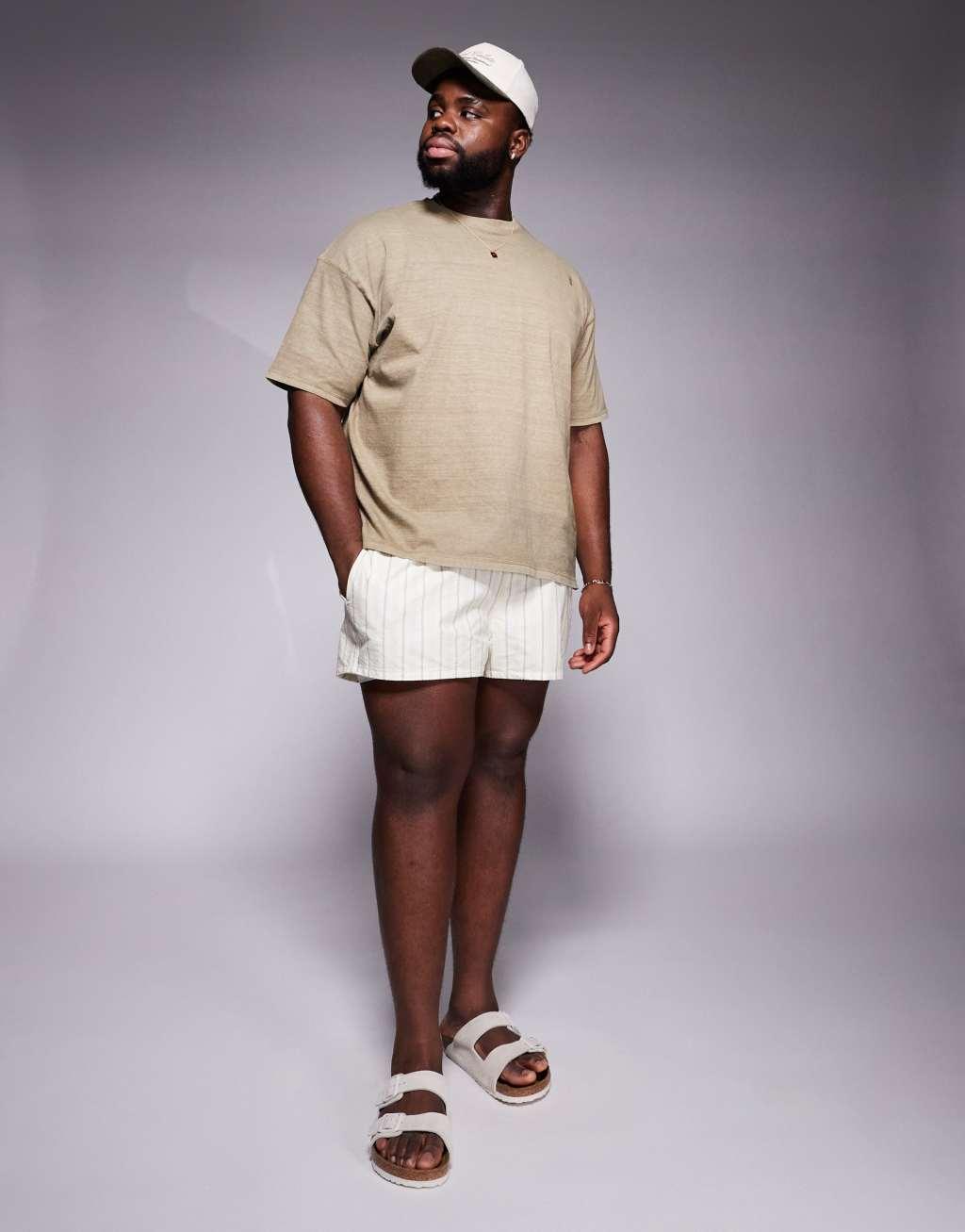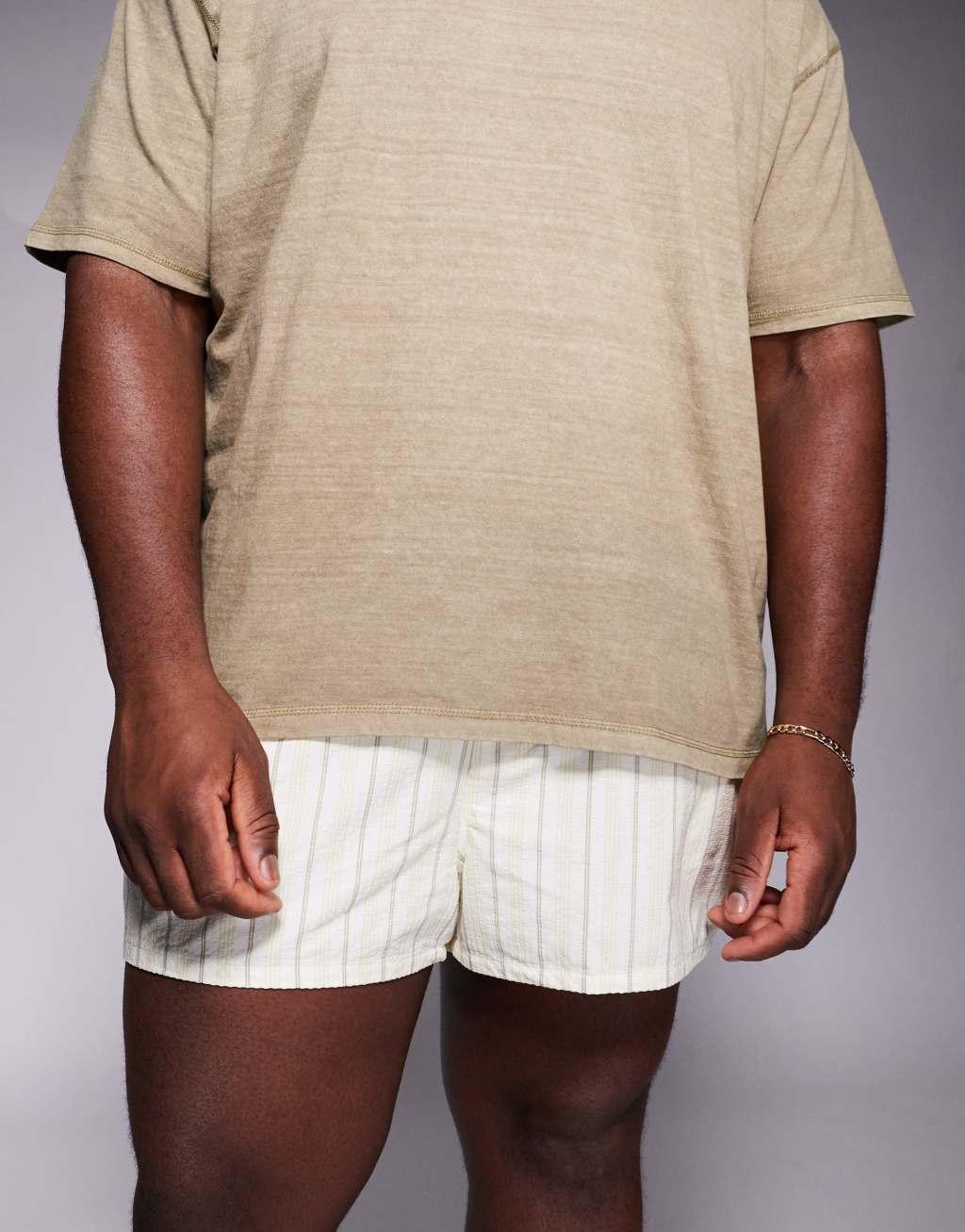ASOS DESIGN seersucker stripe swim shorts in super short length in stone
