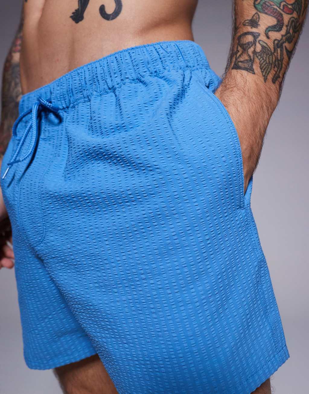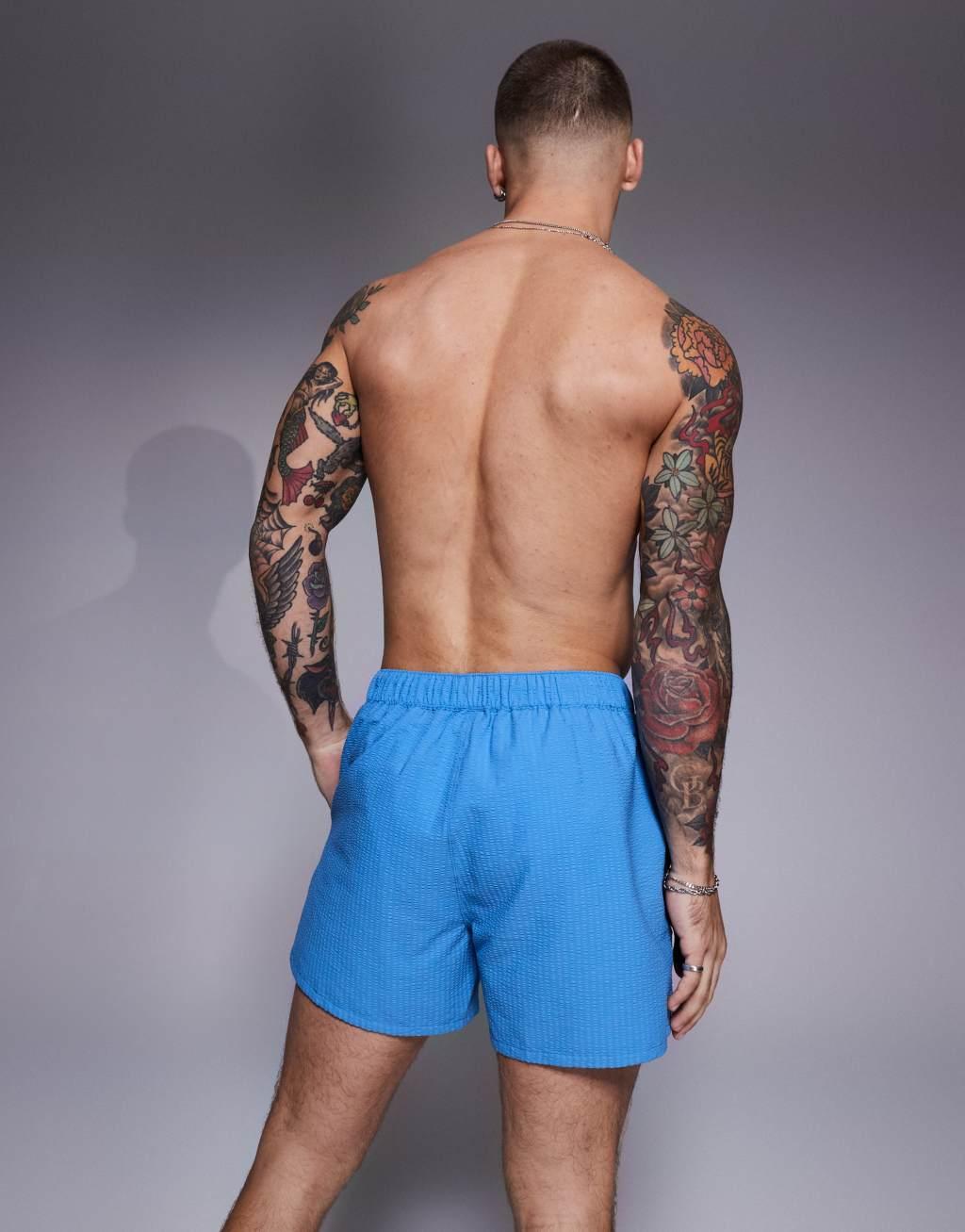 ASOS DESIGN seersucker swim shorts in short length in blue