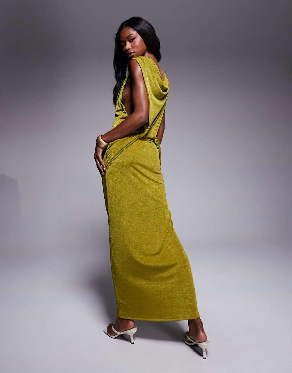 ASOS DESIGN sleeveless maxi dress with plunge cowl back and trim detail in green