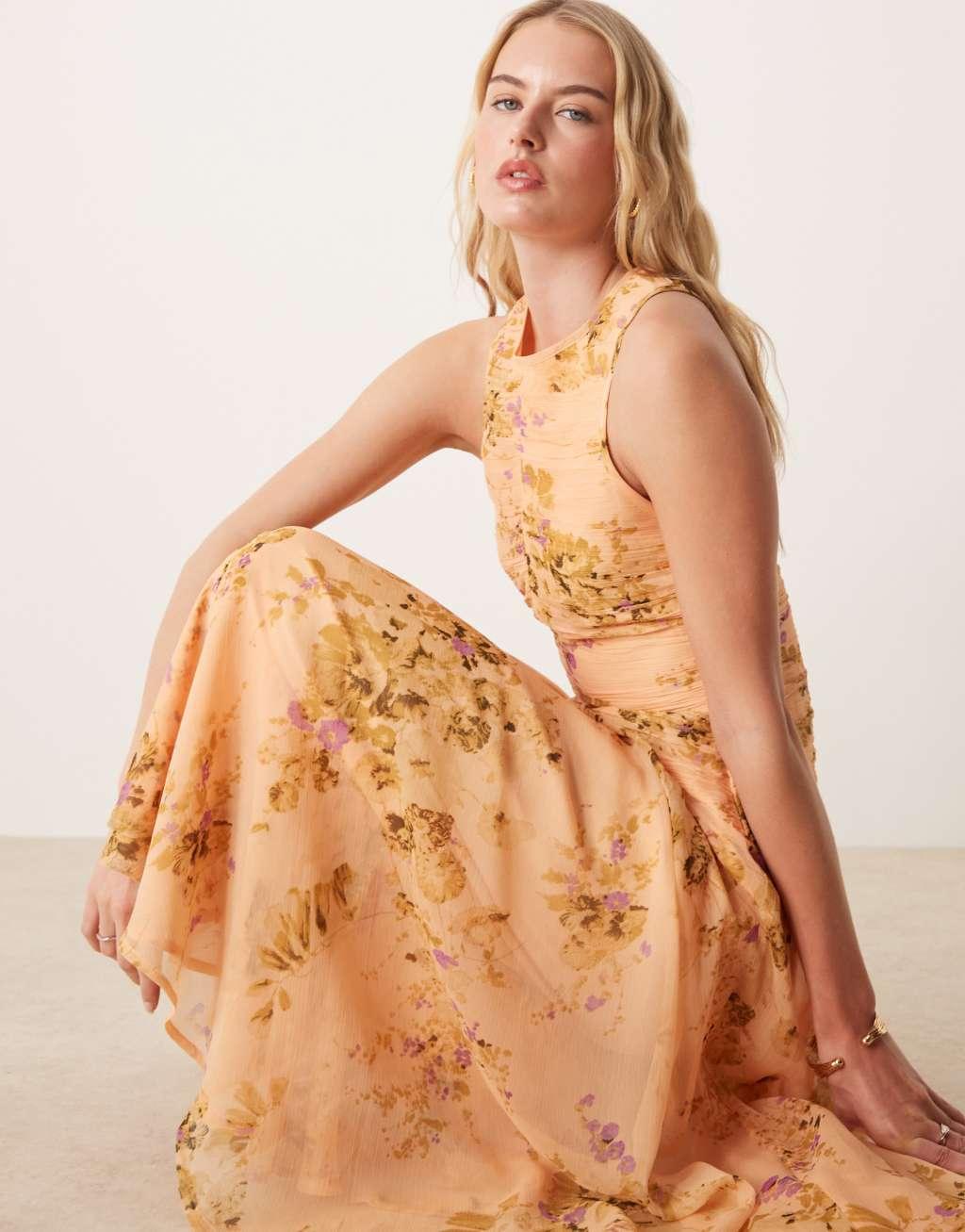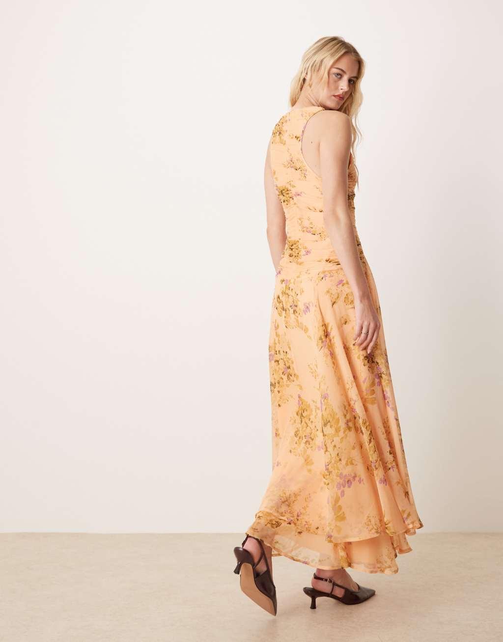 ASOS DESIGN Tall racer neck ruched bodice dropped waist maxi dress in floral print