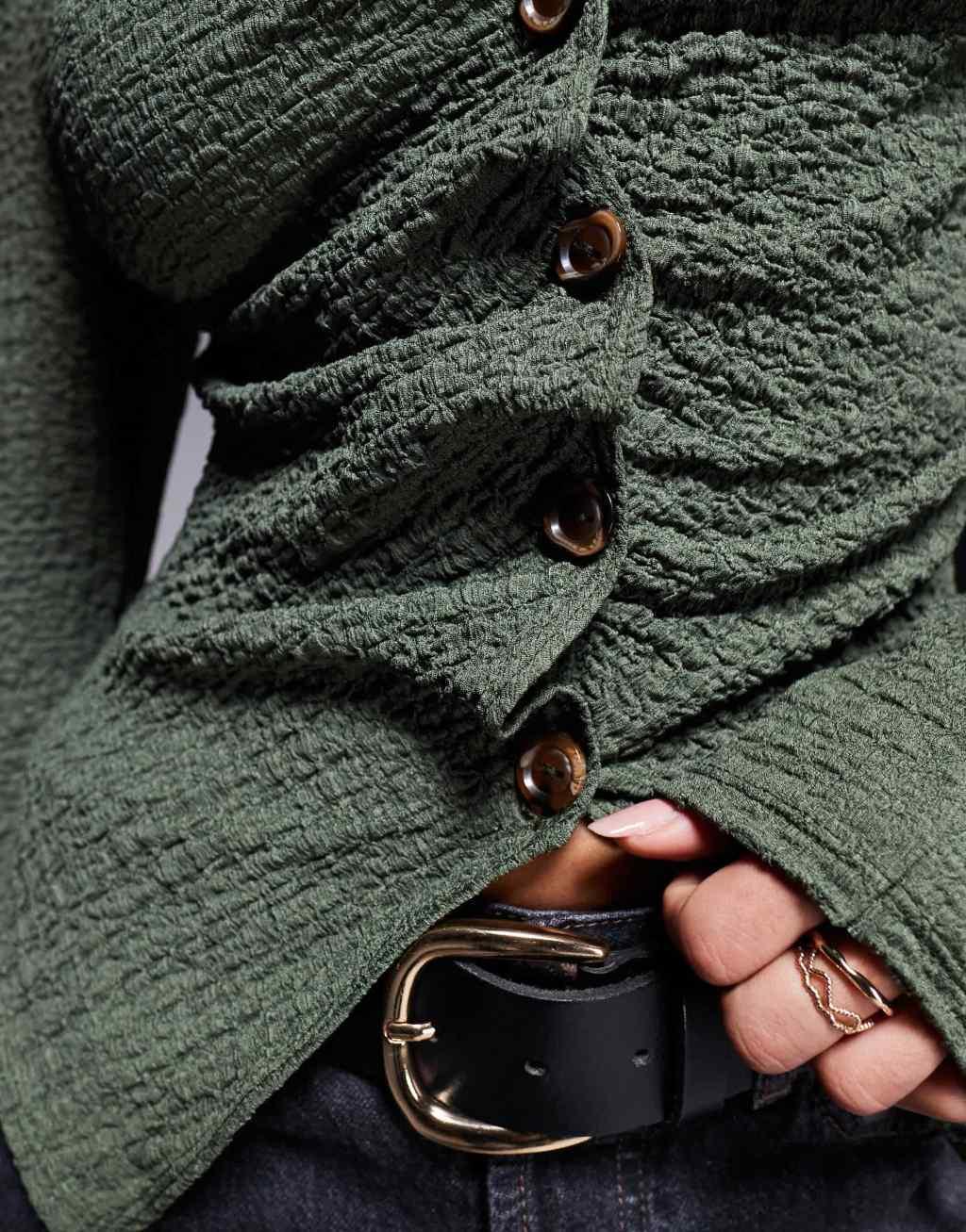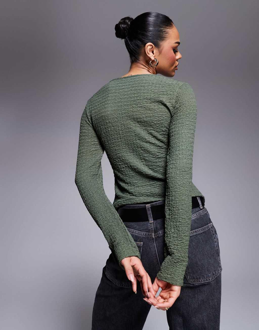 ASOS DESIGN textured button through long sleeve T-shirt in olive