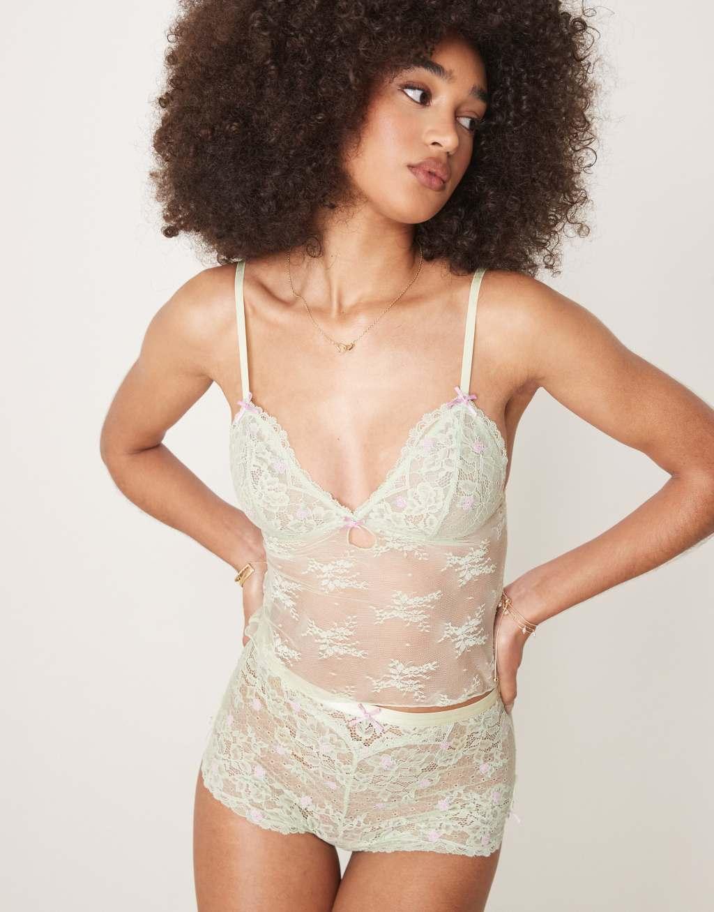 Lingerie & Nightwear by ASOS DESIGN Includes a cami top and a pair of briefs V-neck cami top Triangle cups Adjustable straps Pull-on style Matching briefs High rise Elasticized waistband Flower and bow details