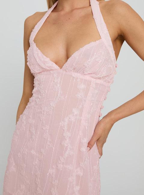 Floral halter mini dress Ruched bust, side button & zip closure, fixed halter strap, partially open back Non-stretch material, fully lined Princess Polly Lower Impact Main & Lining: 100% polyester Cold hand wash