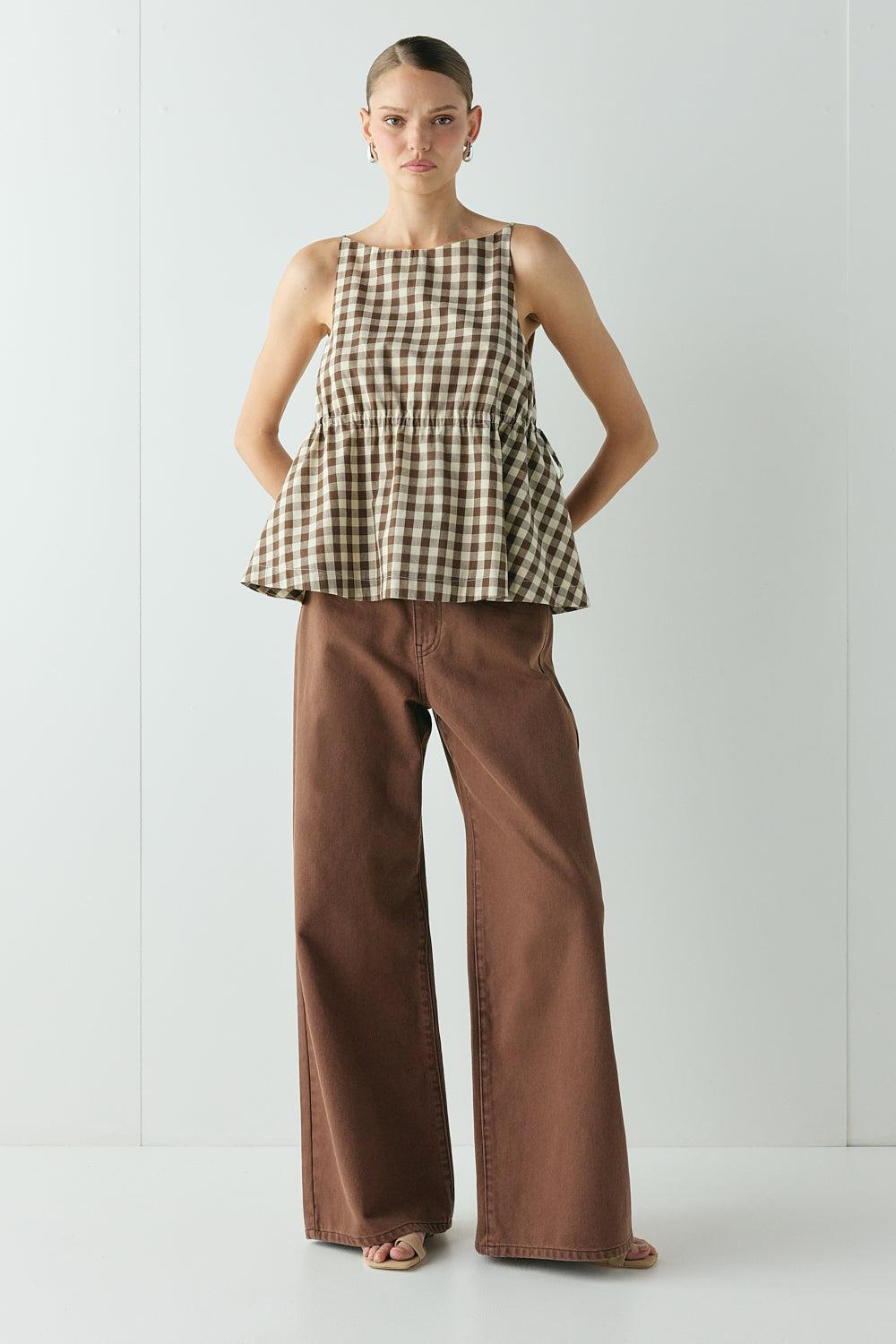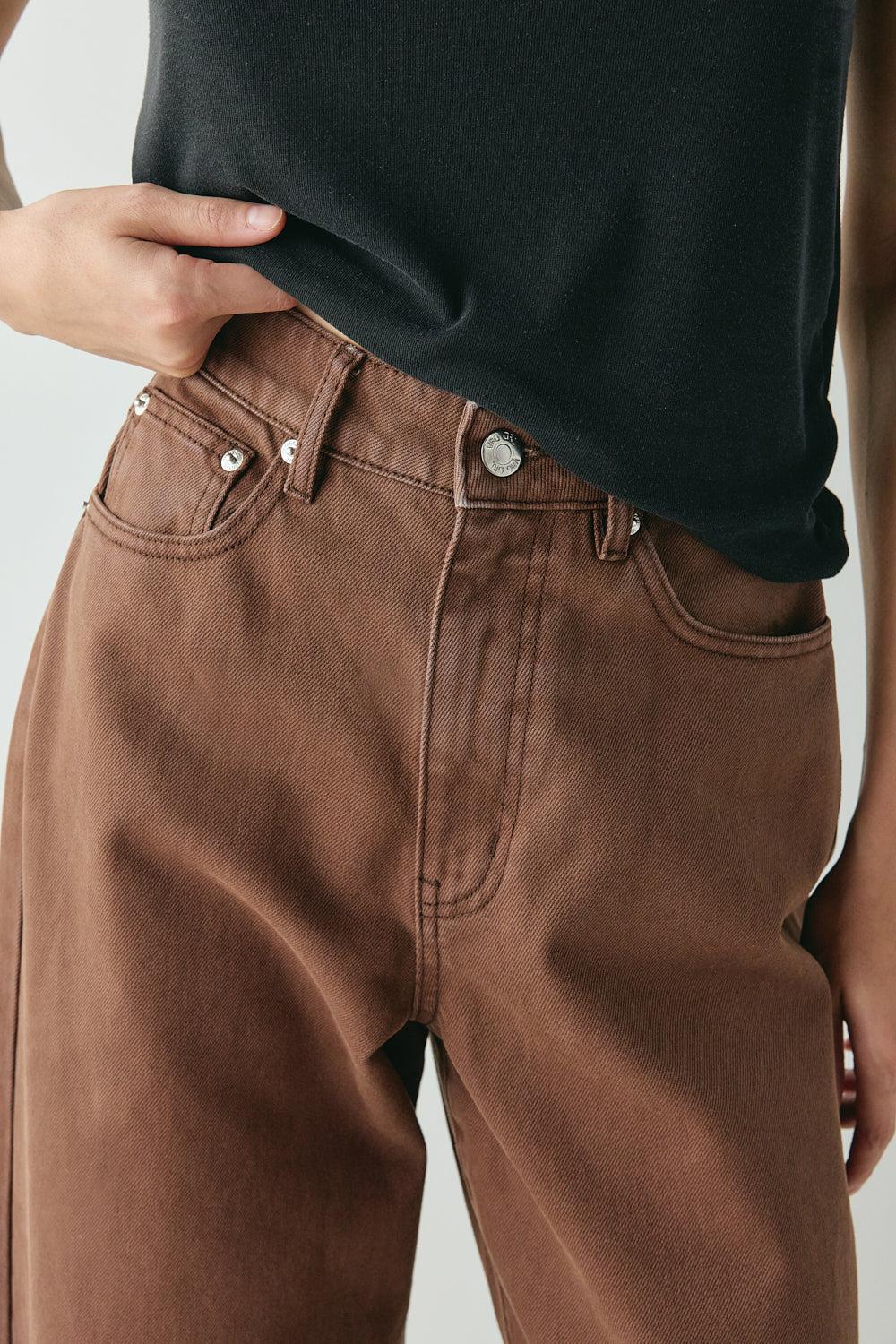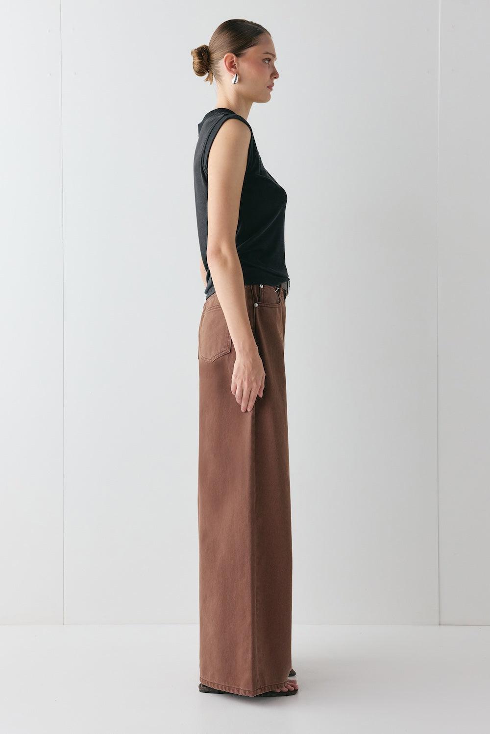 The Aston Jeans are cut from 100% cotton non-stretch denim in a rich chocolate wash with a high waist and straight, structured feel. They feature a classic five-pocket design, zip front closure, belt loops and branded hardware at the back waist. Considered, grounded, and made to wear in over time.