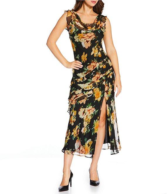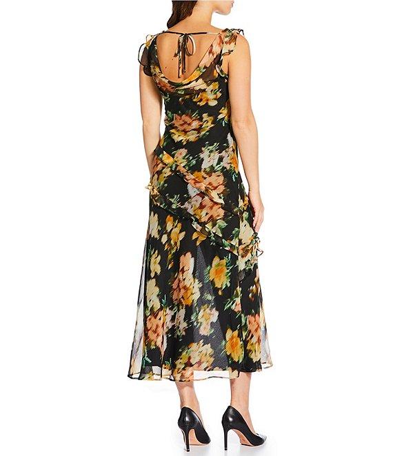 From ASTR the Label, this dress features: Floral print Cowl neckline Sleeveless Side hidden zipper Wraparound asymmetrical ruffle hem Left leg slit above knee Cowl back with self-tie detail Approx. 53.5" length Self: Polyester Lining: Polyester Dry clean only Imported.