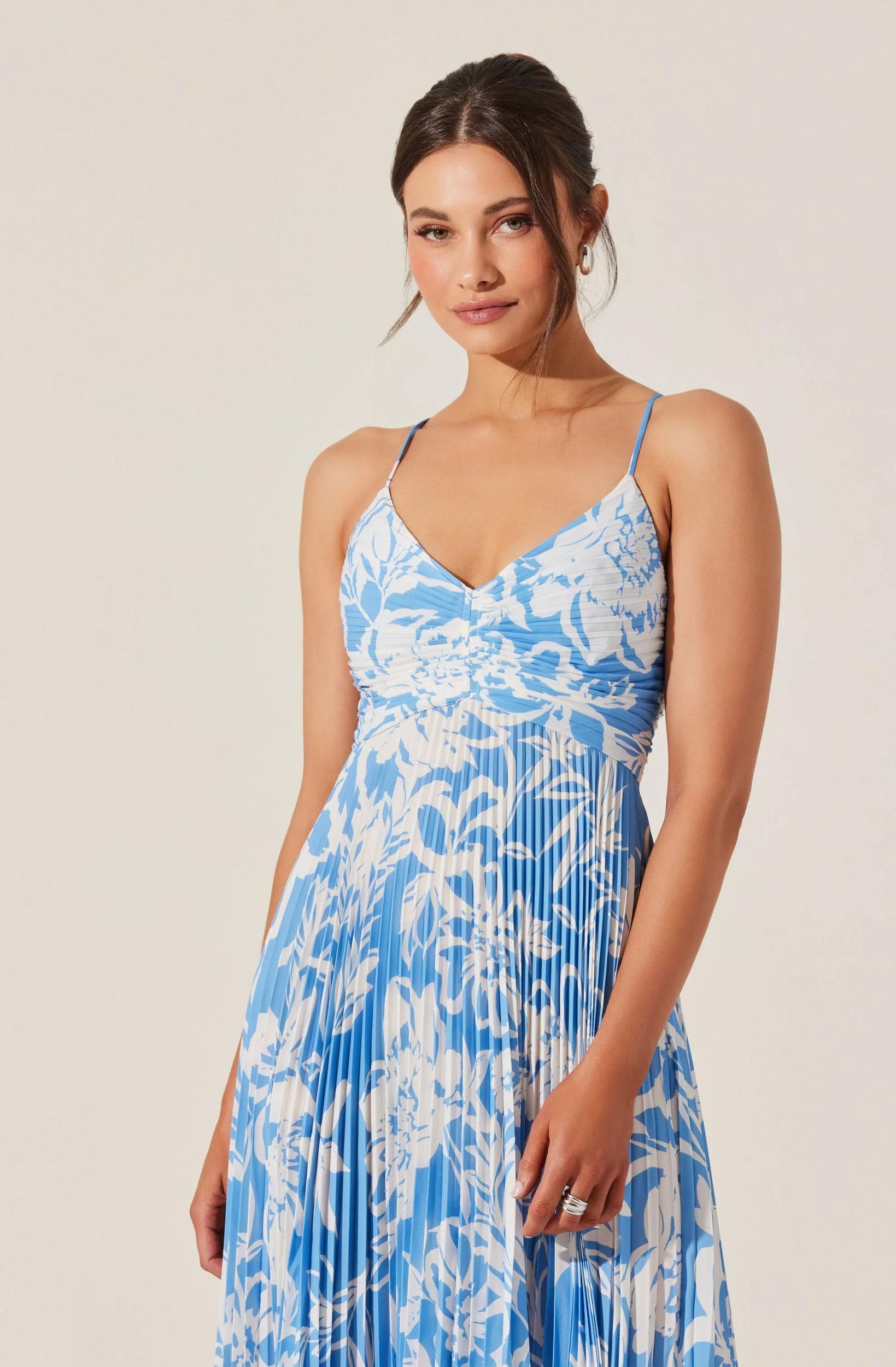 Floral print, plunge neckline, plisse fabrication