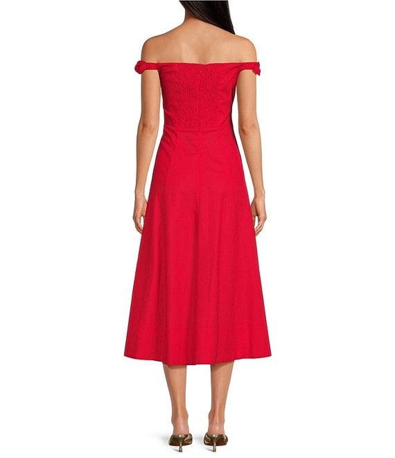 From ASTR the Label, this dress features:Linen fabrication Off-the-shoulder neckline Sleeveless Invisible back zipper closure Decorative center front button detail Center slit above the knee Smocked back panel detail Approx. 45.5" length Self: linen, viscose Lining: rayon Dry clean Imported.