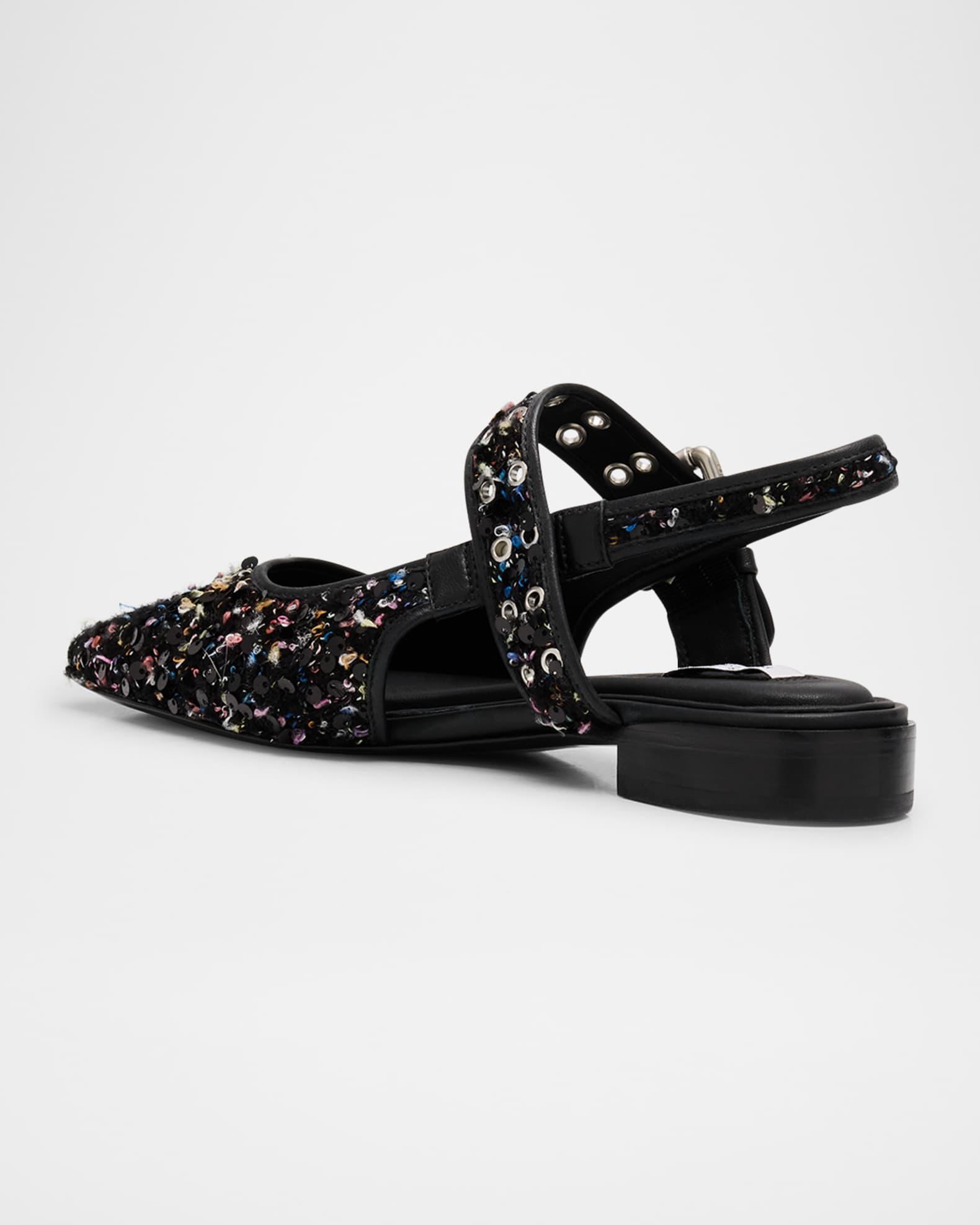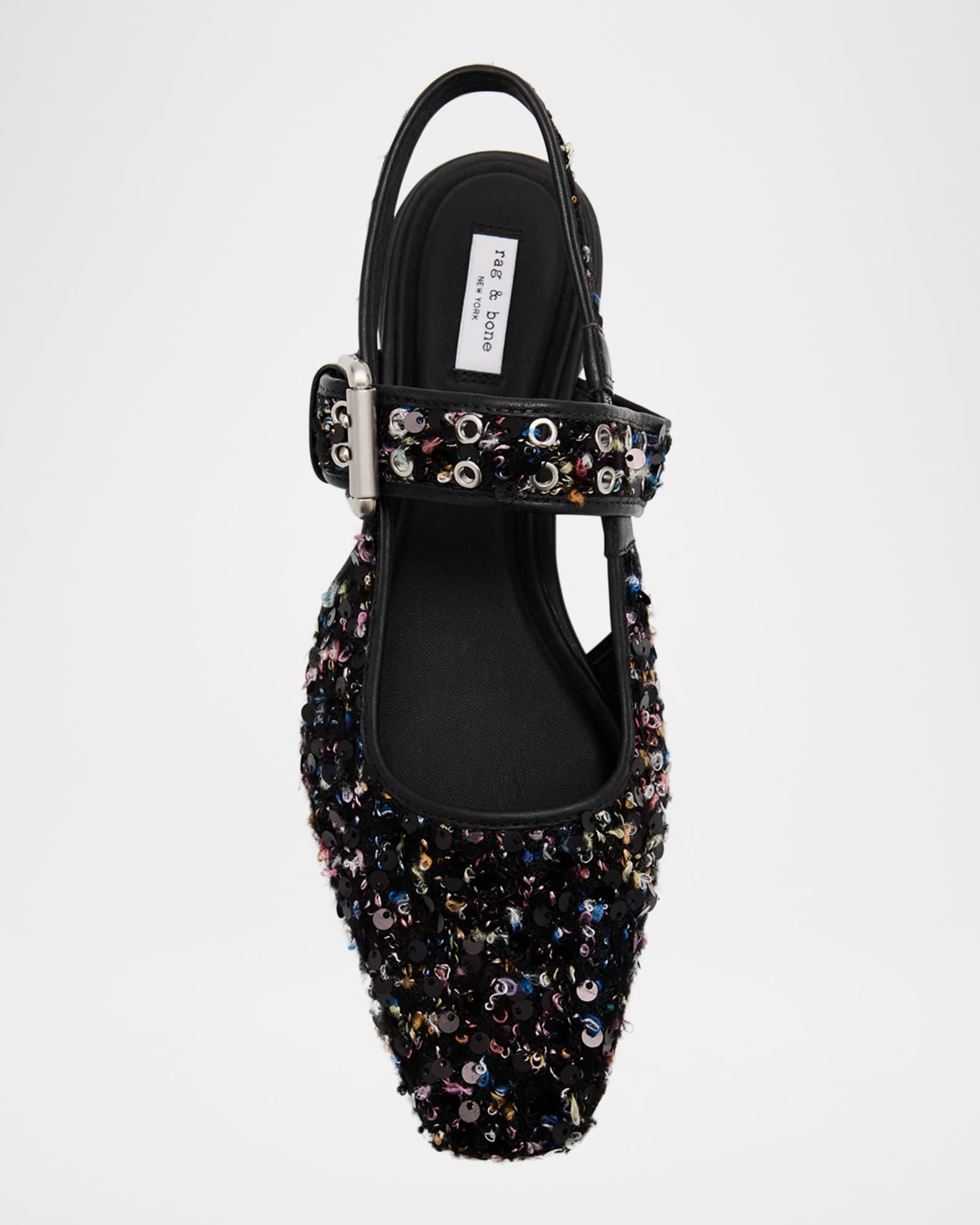 Rag & Bone "Astra" boucle cotton, polyurethane, and leather flats with beaded trim 0.75 in / 20 mm flat heel Almond toe Adjustable buckle mid vamp Slingback ankle strap Leather outsole Lining: Leather Professional cleaning recommended, spot clean Trim: Beaded Imported