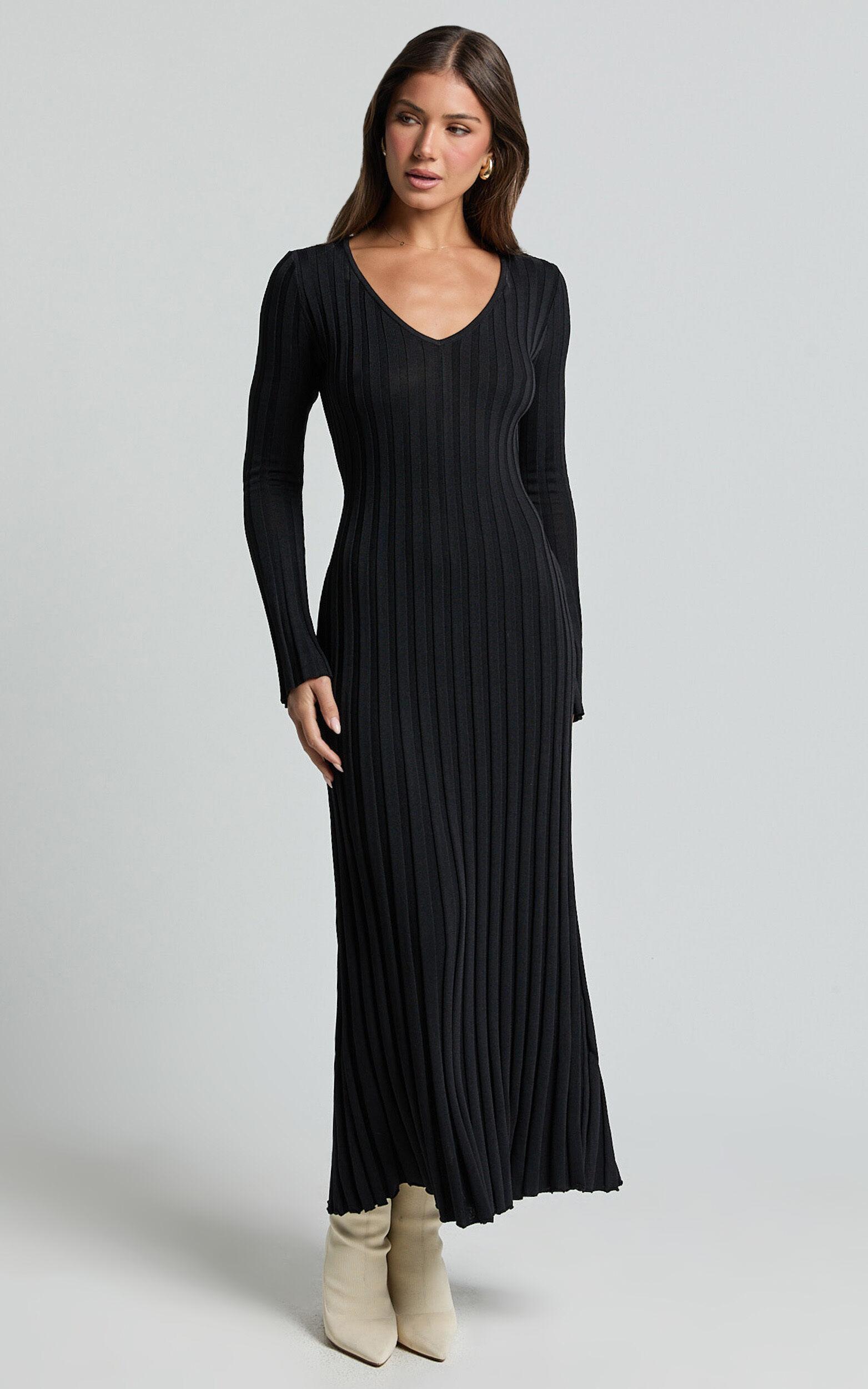 Featuring a flattering V-neckline and long sleeves, this black knit dress effortlessly blends cozy comfort with minimalist elegance. Inspired by the timeless monochrome trend, its versatile silhouette makes it the perfect choice for anything from relaxed daytime hangouts to glam evening outings.Keep your look fresh and street-inspired by teaming the Astra Maxi Dress with chunky ankle boots and an oversized denim jacket, or opt for classic sophistication with strappy heels and bold gold jewelry. With its blend of easy sophistication and vintage-inspired charm, this maxi dress is destined to become your new go-to wardrobe favorite!Product Details:Pull on styleKnit DressFully Fashioned KnitV NeckCasual wearMaxi lengthLong SleeveMade of Viscose