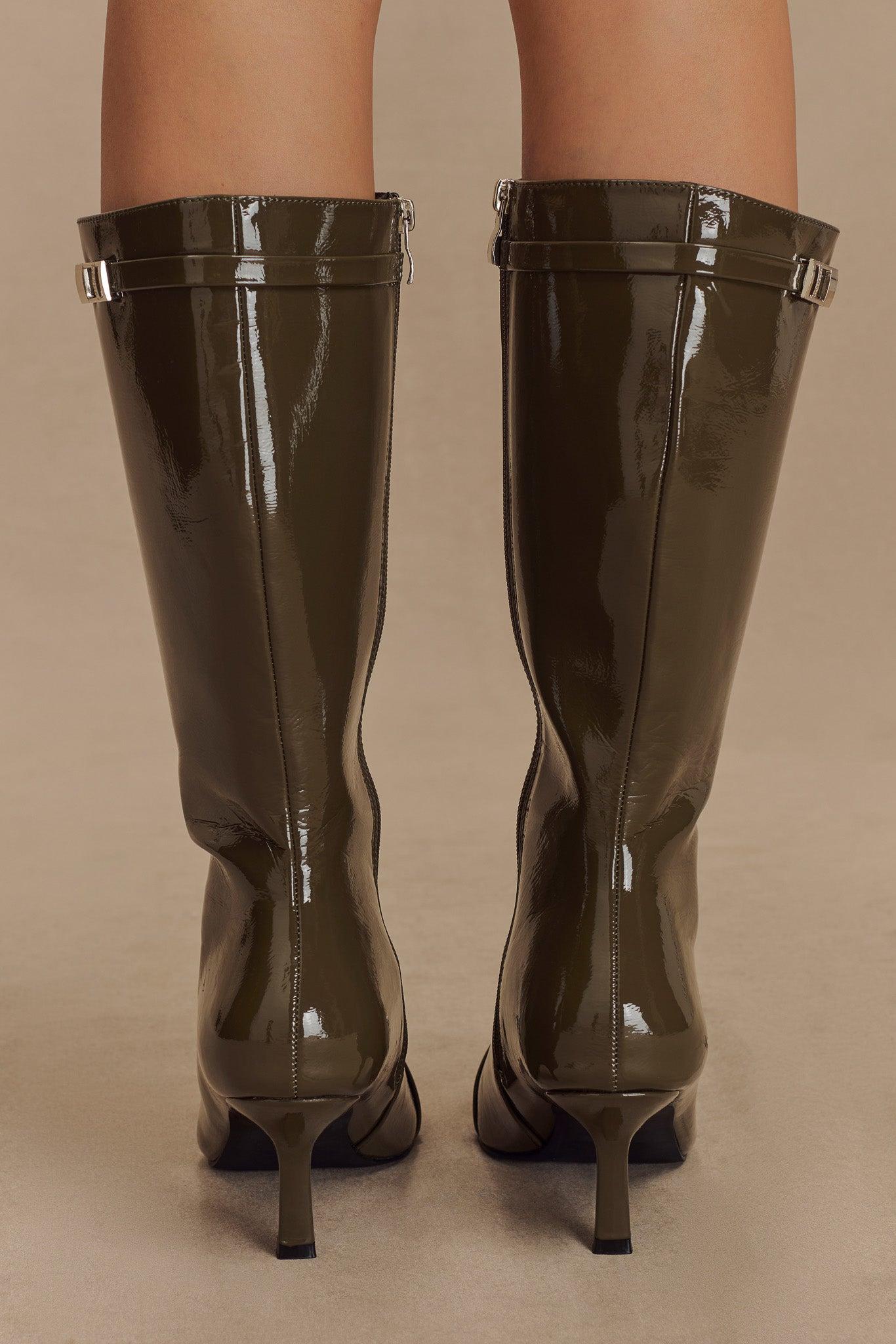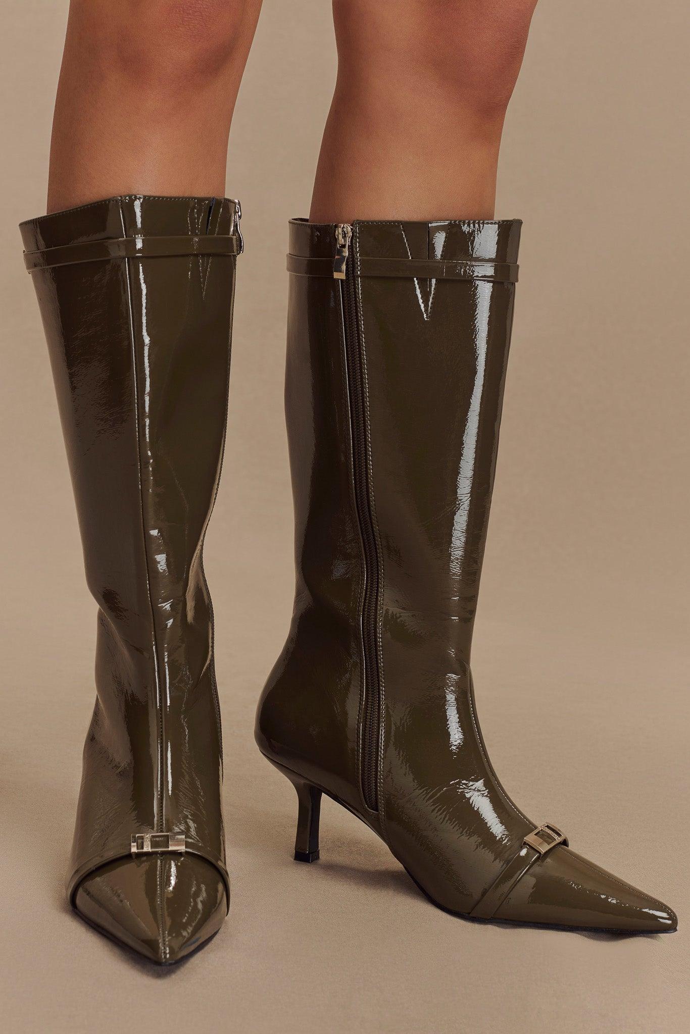 Stylish strides. The ASTRA Faux Leather Buckle Boot is a stylish statement piece that combines edgy design with sophisticated details. Featuring a pointed toe and a sleek 7cm heel, this knee-length boot offers a modern, elongated silhouette. The buckle and strap detailing at the toe and calf add a distinctive, fashion-forward touch, making the Astra Boot a versatile choice for both day and evening wear. Crafted from faux leather, it provides a chic, cruelty-free option for your footwear collection.