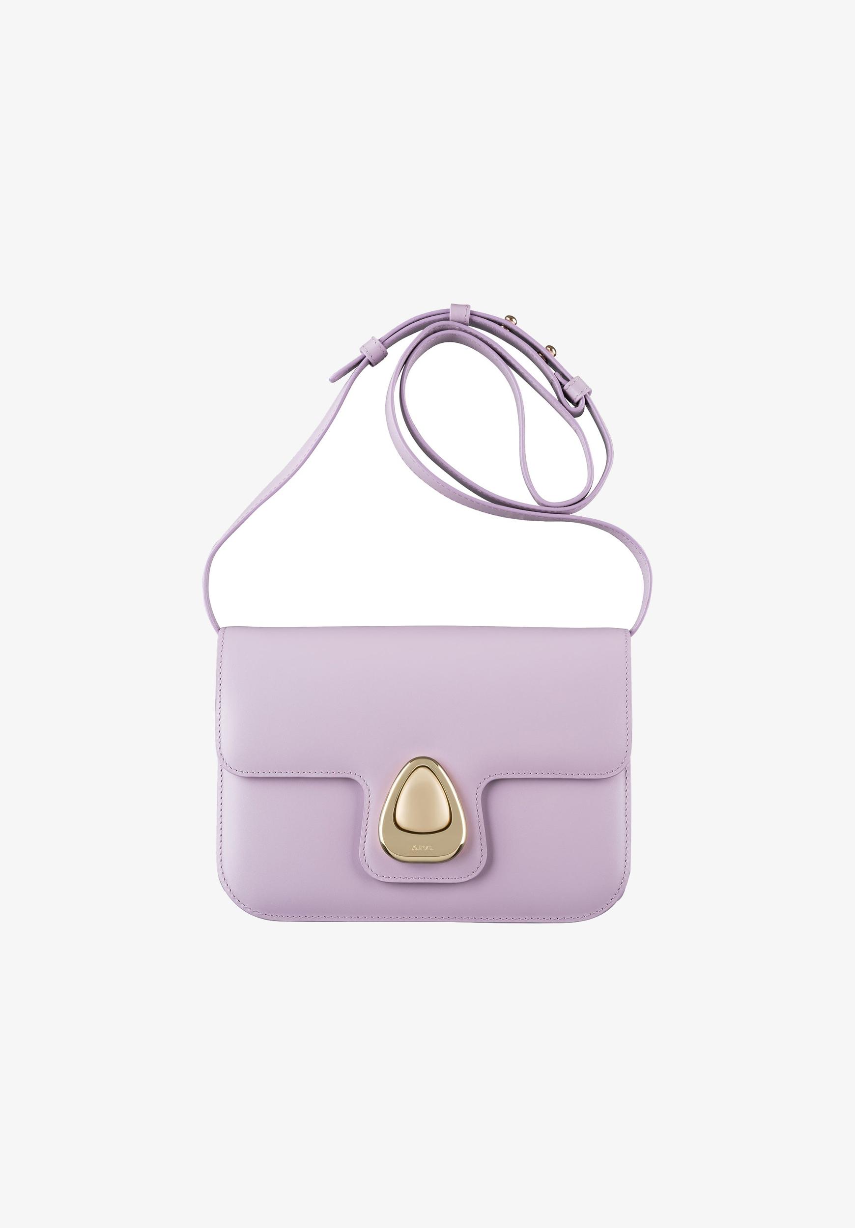 A.P.C. Women's bag. - Handbag with a jewelry-style clasp with 80s inspiration. - Soft cowhide leather. - Adjustable leather strap. May be carried on shoulder or across chest. - Goldtone magnetic clasp. - Flap lined in cowhide suede split. - Two compartments and one pocket on interior. - Embossed goldtone A.P.C. logo on clasp. - Available in a larger version, the Astra bag.