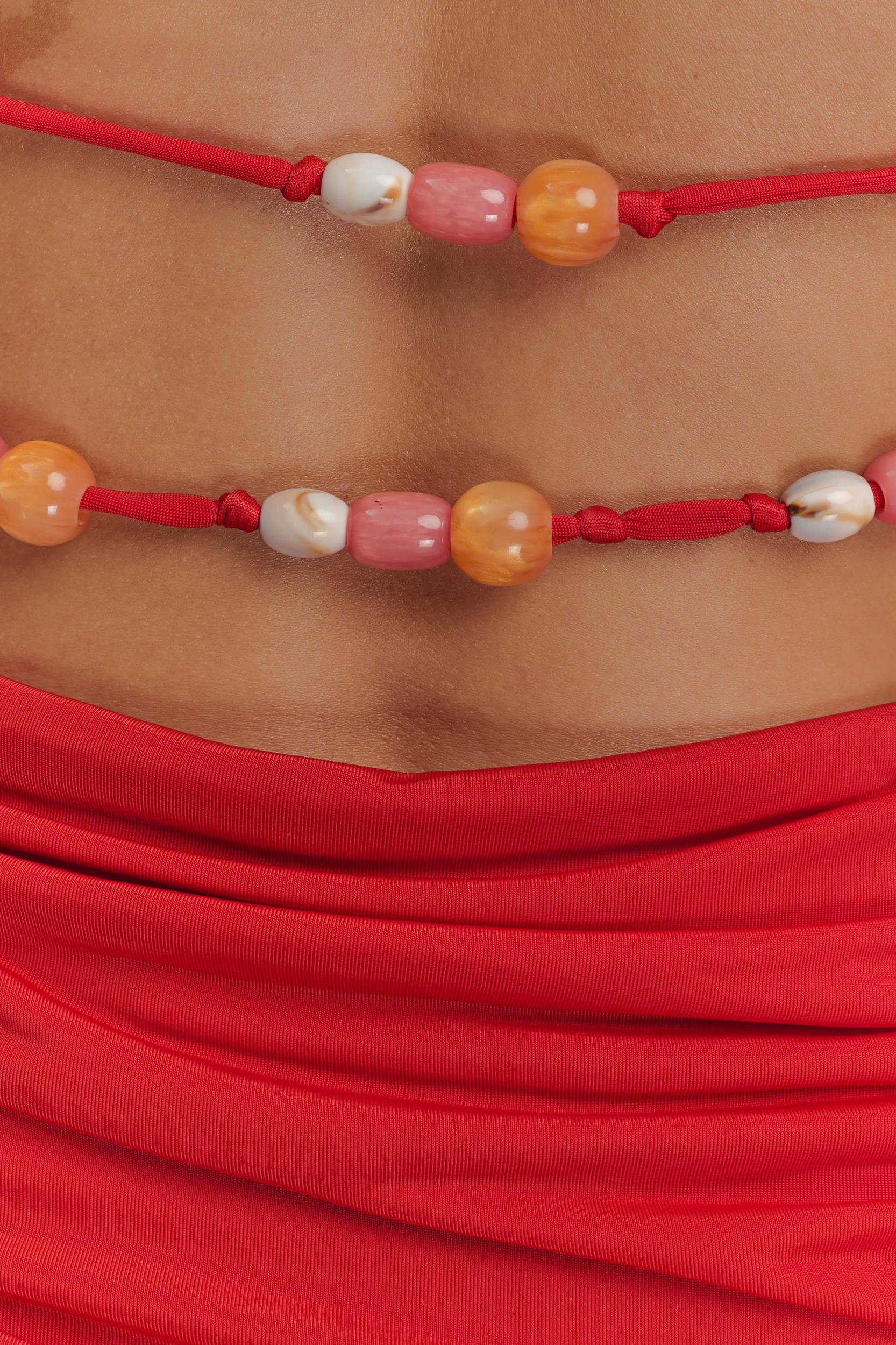 Beaded beauty, endless allure. The ASTRAEUS Beaded Cowl Mini Dress is designed for moonlit moments and unforgettable entrances. Featuring a fluid draped cowl neckline and halter neck tie adorned with delicate beading, this fully lined mini silhouette offers a soft bloused bodice that contrasts with a bodycon ruched skirt for a sculpted finish. Beaded detailing at the neck and back adds a touch of shimmer, making this dress the perfect pick for evening events, cocktail hours, or seaside celebrations.