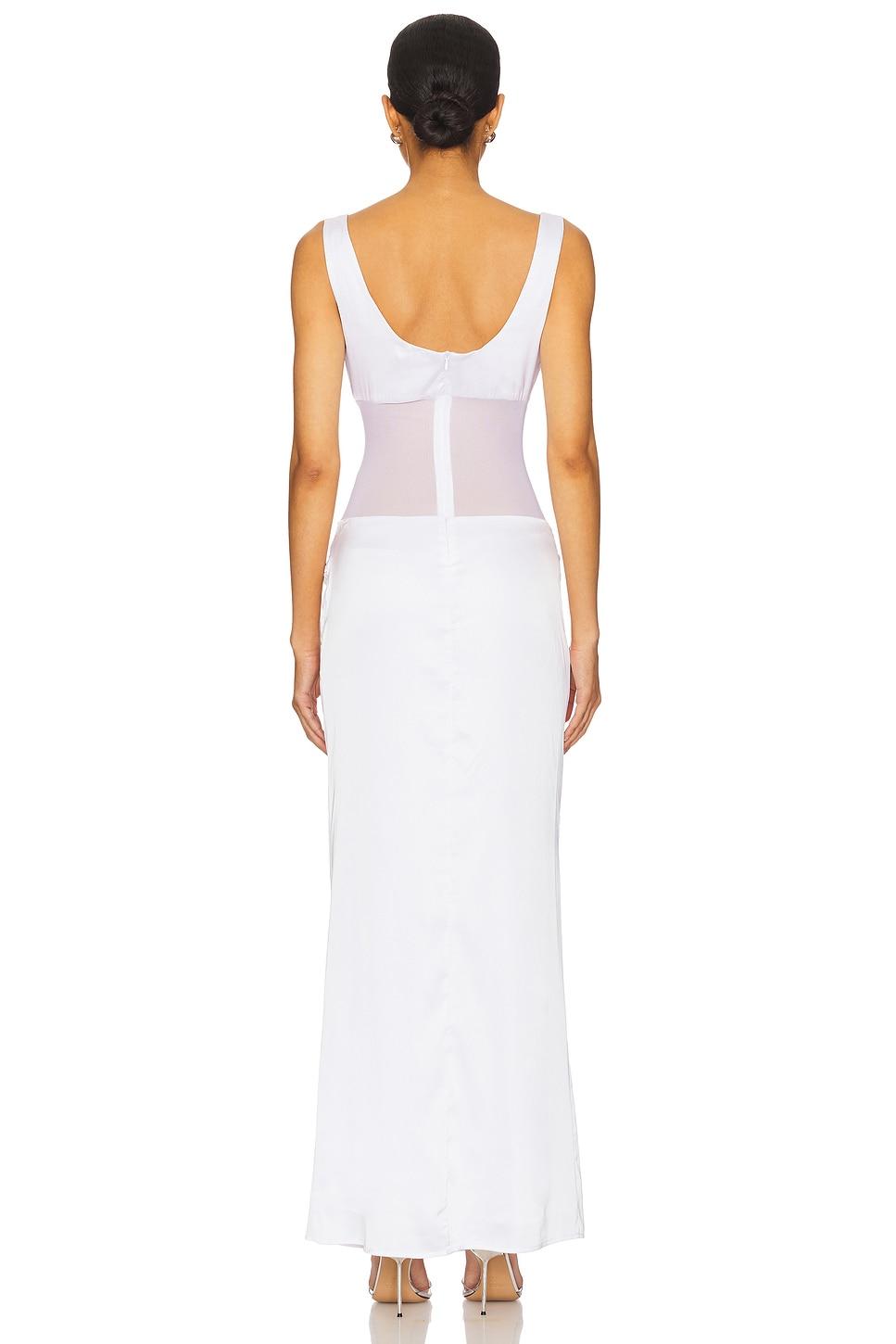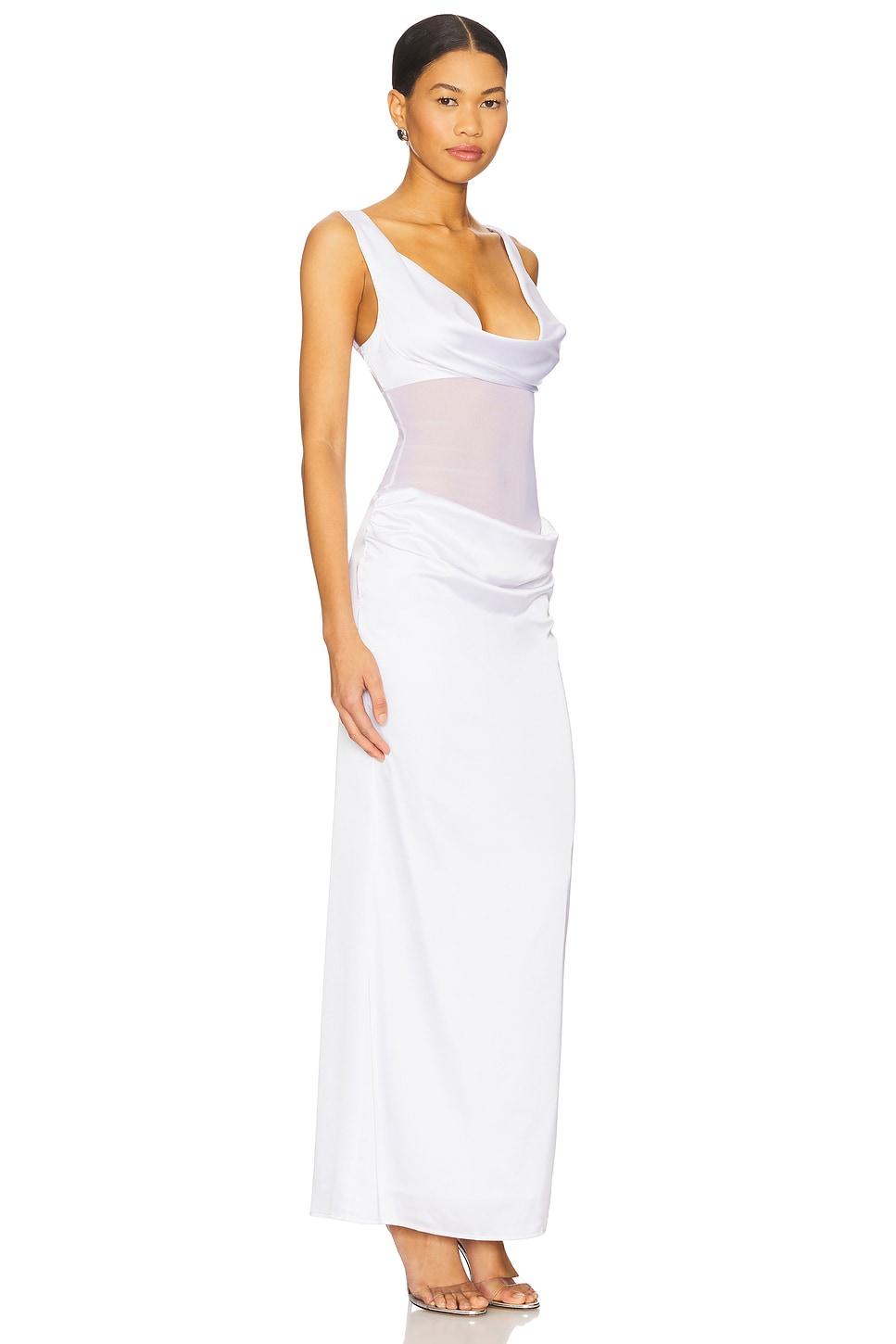 Self 1: 100% polyesterSelf 2: 88% nylon, 12% elastaneLining: 95% polyester, 5% elastane. Hand wash. Partially lined. Hidden back zip closure. Wrap around mesh panel. Draped skirt. Lightweight satin fabric. Made in China. Revolve Style No. SPDW-WD2903. Manufacturer Style No. SDD4127 H24.
