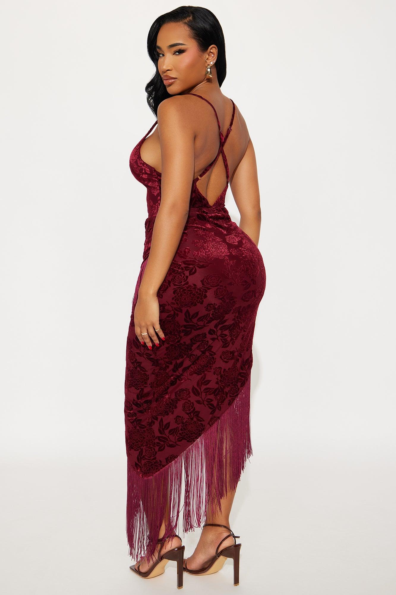Available In Wine. Cowl Neck Midi Dress Wrap Front Backless Adjustable Back Straps Fringe Detail Asymmetrical Skirt No Stretch Lined Length Measured Flat = 55" Disclaimer: To Keep The Aesthetic Of This Garment, Please Follow The Care Instructions Carefully. Self: 70% Polyester 20% Nylon 10% Spandex Lining: 100% Polyester Imported