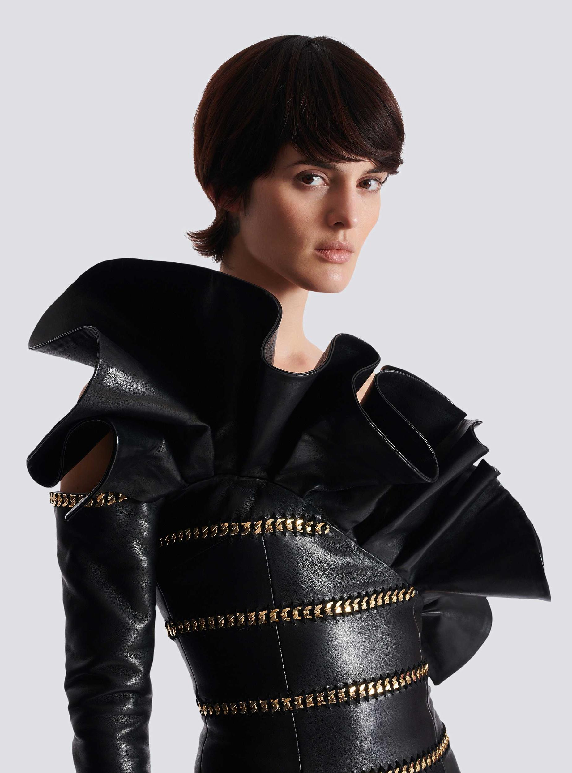 Asymmetric lambskin leather bodycon dress with chainsAsymmetric neckline with leather ruffle on the frontSingle strapSingle long sleeve with visible golden metal zip on the cuff, engraved Balmain Paris sliderEmbellished with braided golden metal chains and a leather tieVisible gold metal zip fastening on the back with Balmain Paris-engraved sliderTwill liningCropped slim fitModel measures 178cm and wears a size 36Main material: 100% lambskinMade in TurkeyItem: FF1R8850LD63