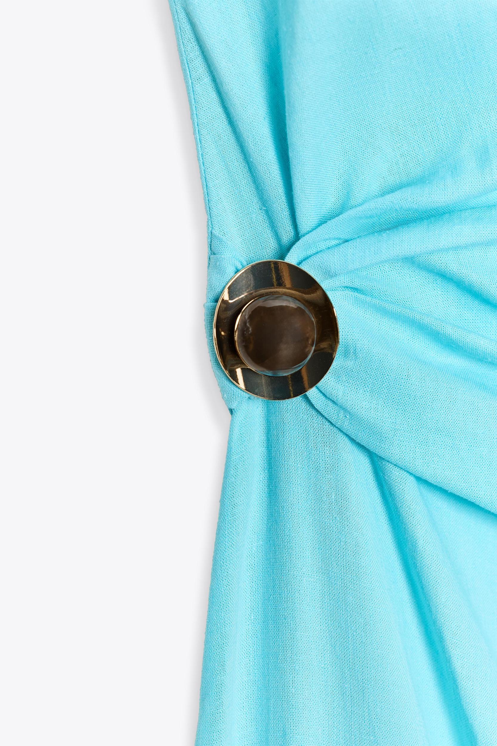 Dress made of linen. Asymmetric neckline and sleeveless design with a twisted shoulder. Gold appliqué detail at the waist. Interior lining. Hem with vent at the back. Side hidden in-seam zip closure.