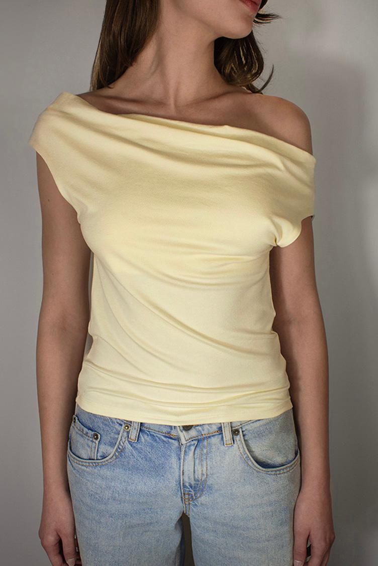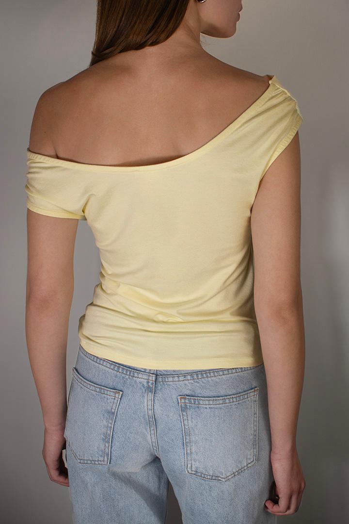 Asymmetric neckline top, short sleeves, regular length, slim fit.