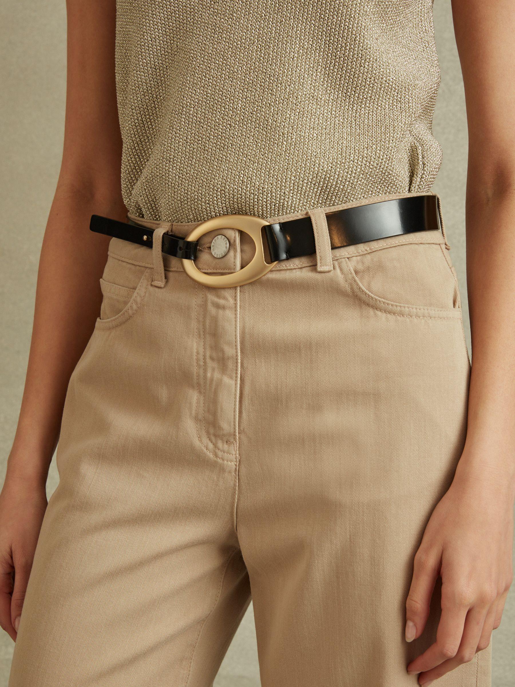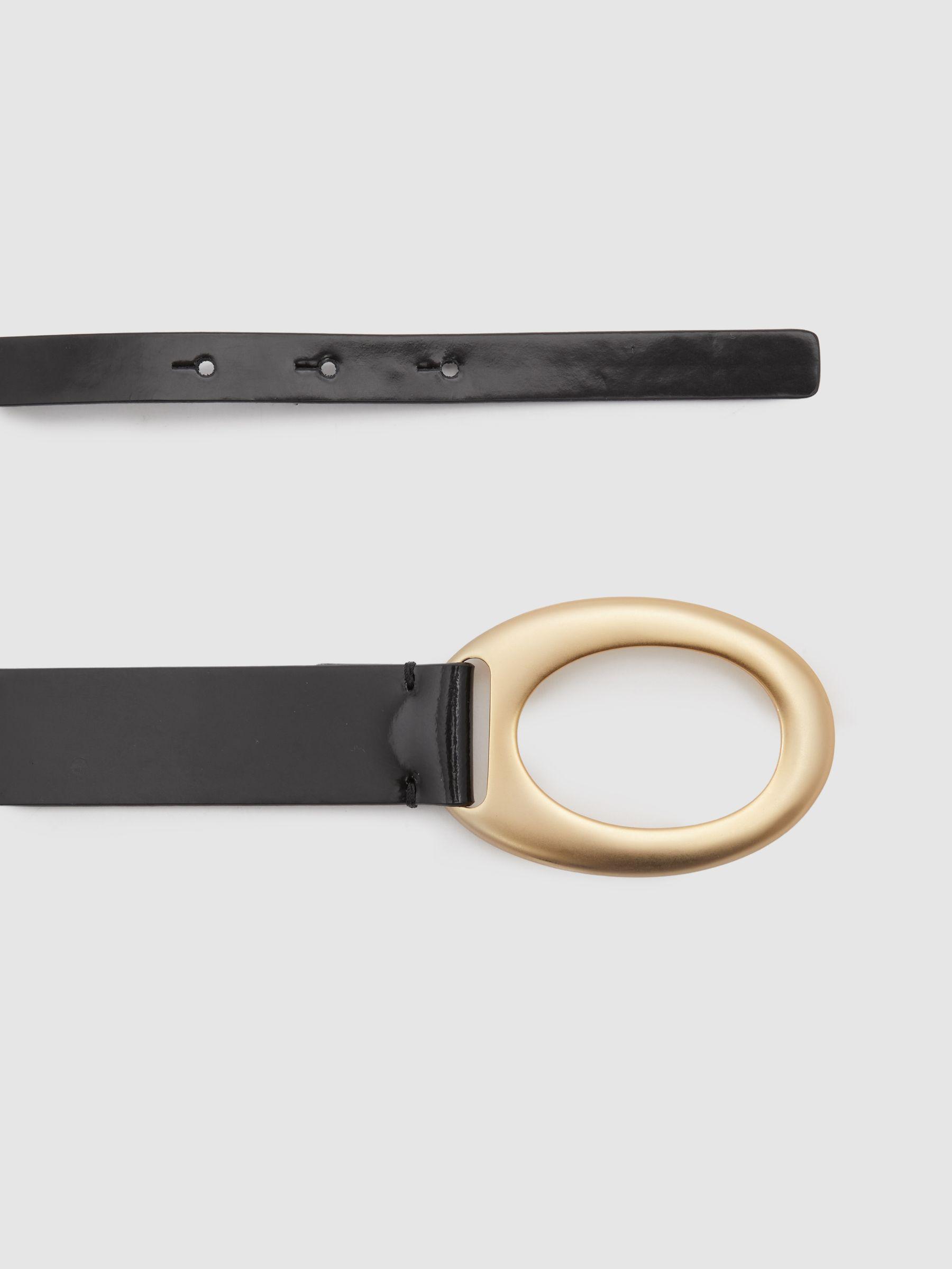 The Ellis belt is made from leather with a premium, patent finish. Its asymmetric shape sees one thin strap and one wide strap stitched together at the back, and fastened at the front with a gold-tone oval buckle. 100% leather Asymmetric shape Gold-tone oval buckle