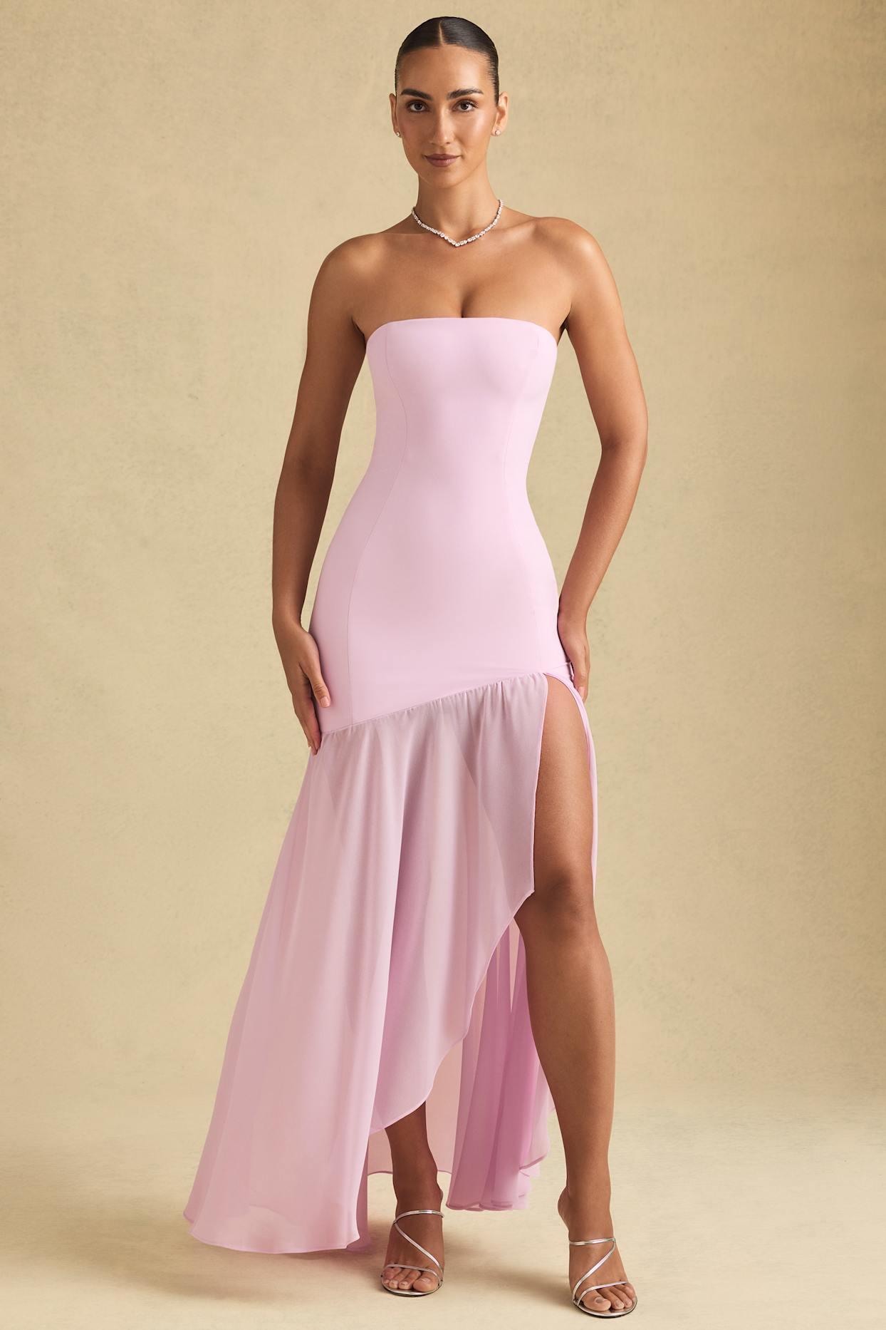 Glamour in every step. Guaranteed to turn heads, the Melina maxi dress is crafted from premium chiffon with a figure-hugging strapless bodice and sheer asymmetric skirt. It’s elevated with contouring seams at the front and back, cut to a universally flattering fishtail silhouette, and complete with a thigh-high front split.Bandeau neckStraplessContouring princess seamsFitted bodice Sheer asymmetric skirtThigh-high front splitConcealed side zip fasteningFishtail silhouetteMaxi length, SNP to hem approx. 159cm based on a UK size 8Product code: 14185