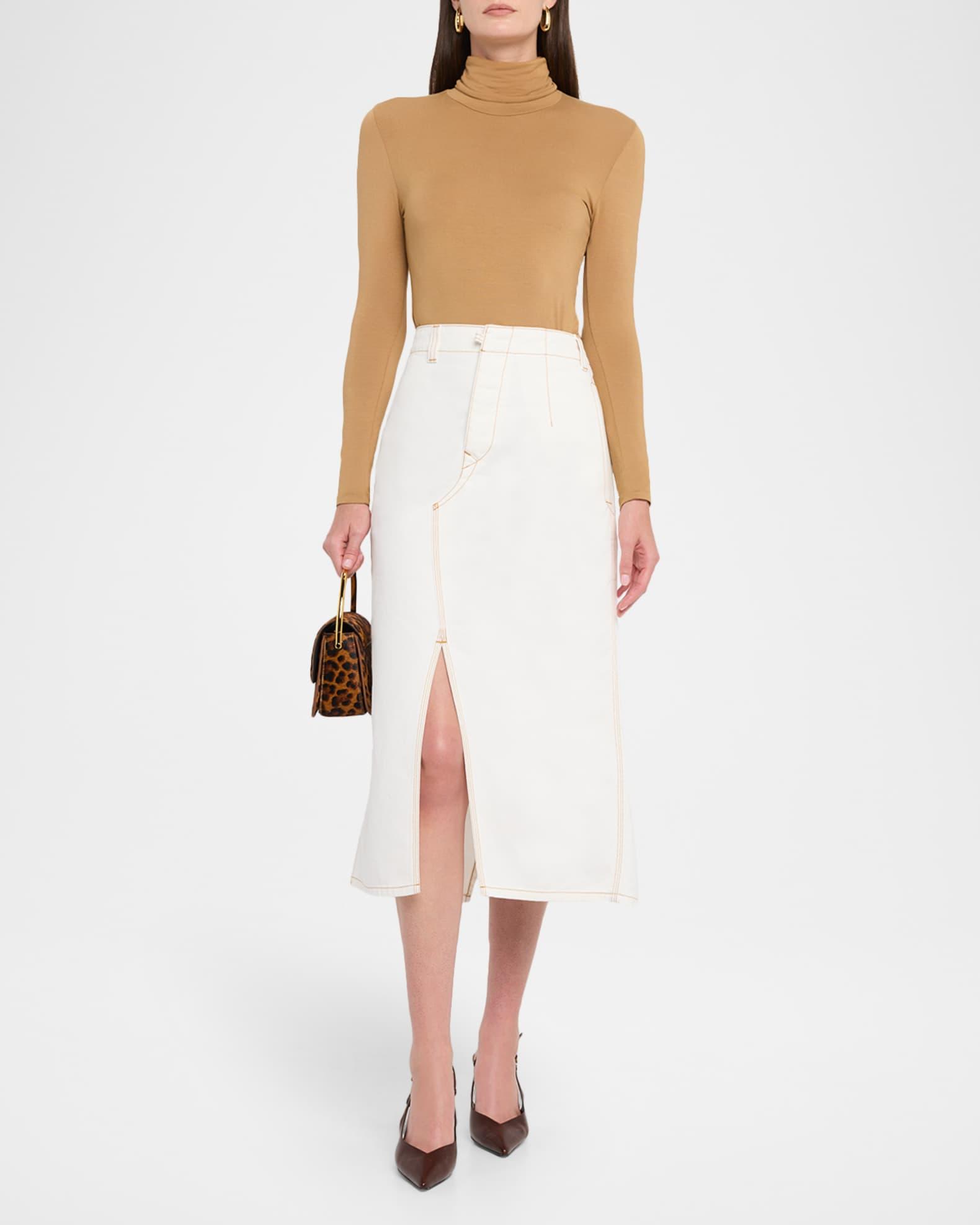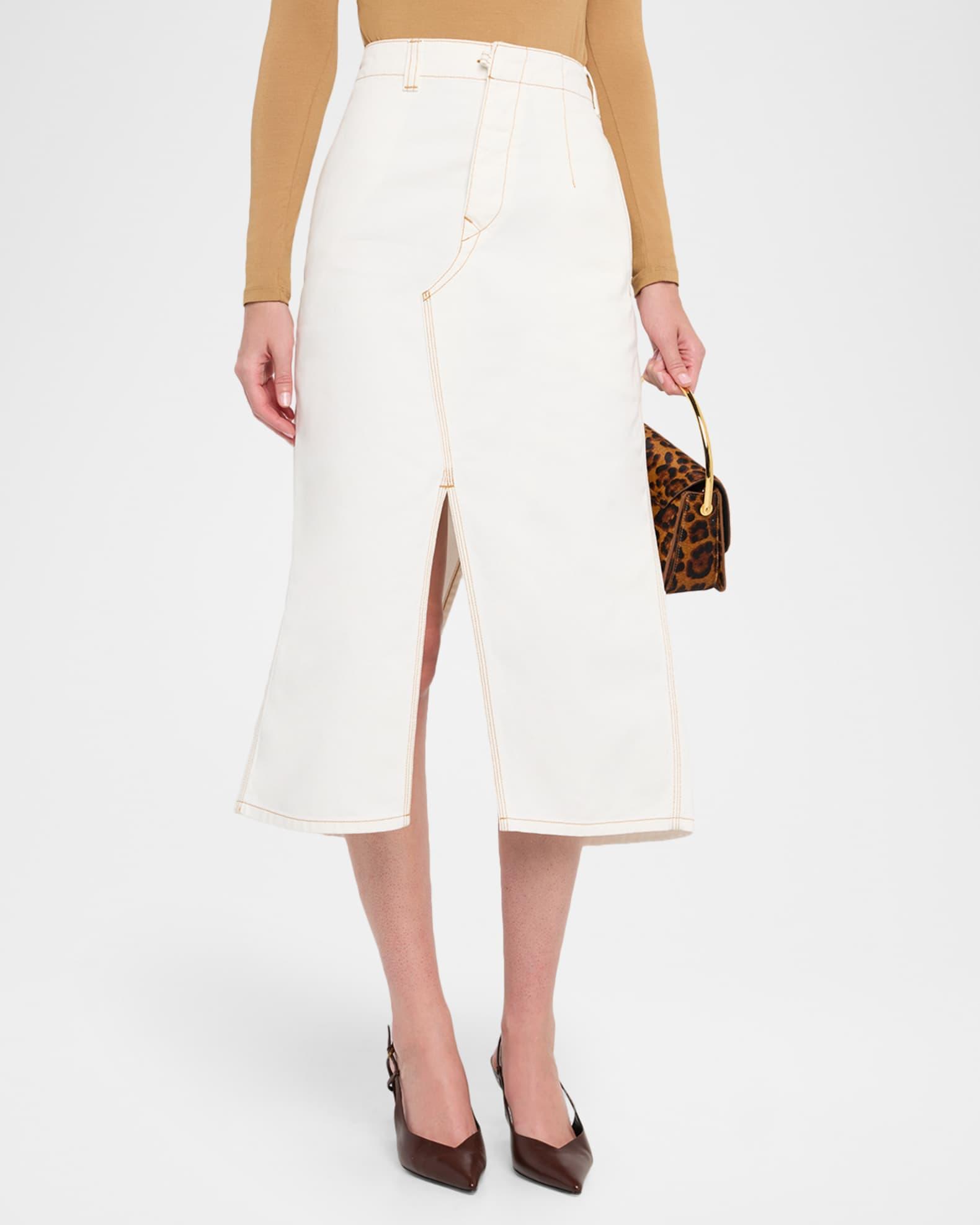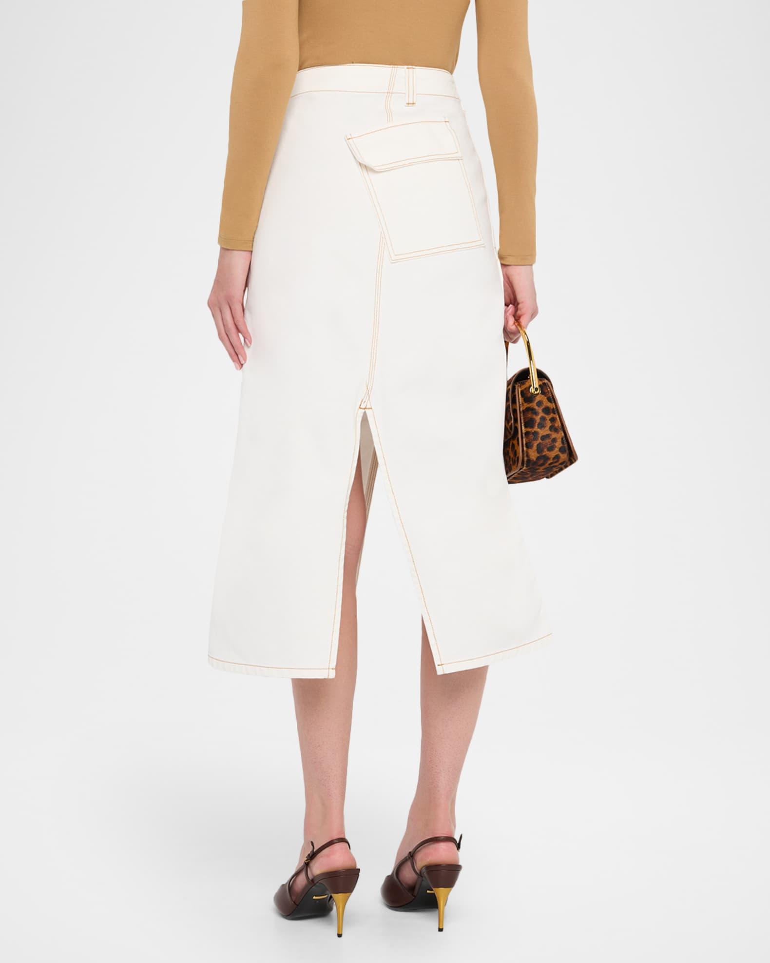 Victoria Beckham asymmetric utility skirt featuring front and back slits and contrast topstitching High waist Hip welt pocket Back flap pocket Hem falls below the knee A-line silhouette Hook/zip fly; belt loops Cotton Dry clean Made in Italy