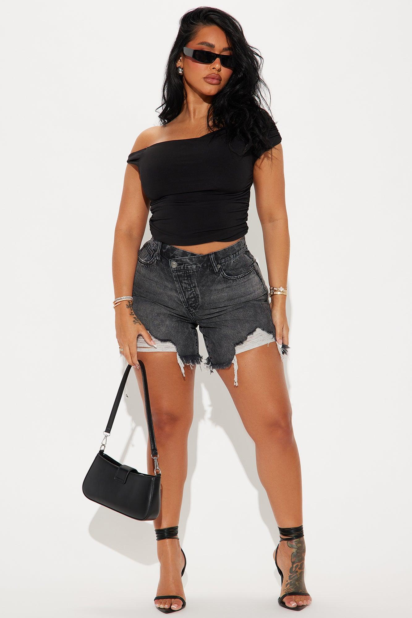 Available In Dark Wash, Grey And Medium Wash. Denim Short Non Stretch Ripped Crossover Waistband 5 Pocket Fray Hem 5.5" Inseam 11.75" Rise Disclaimer: Due To The Specialized Wash & Distressing Process, Each Garment Is Unique 100% Cotton Imported Imported