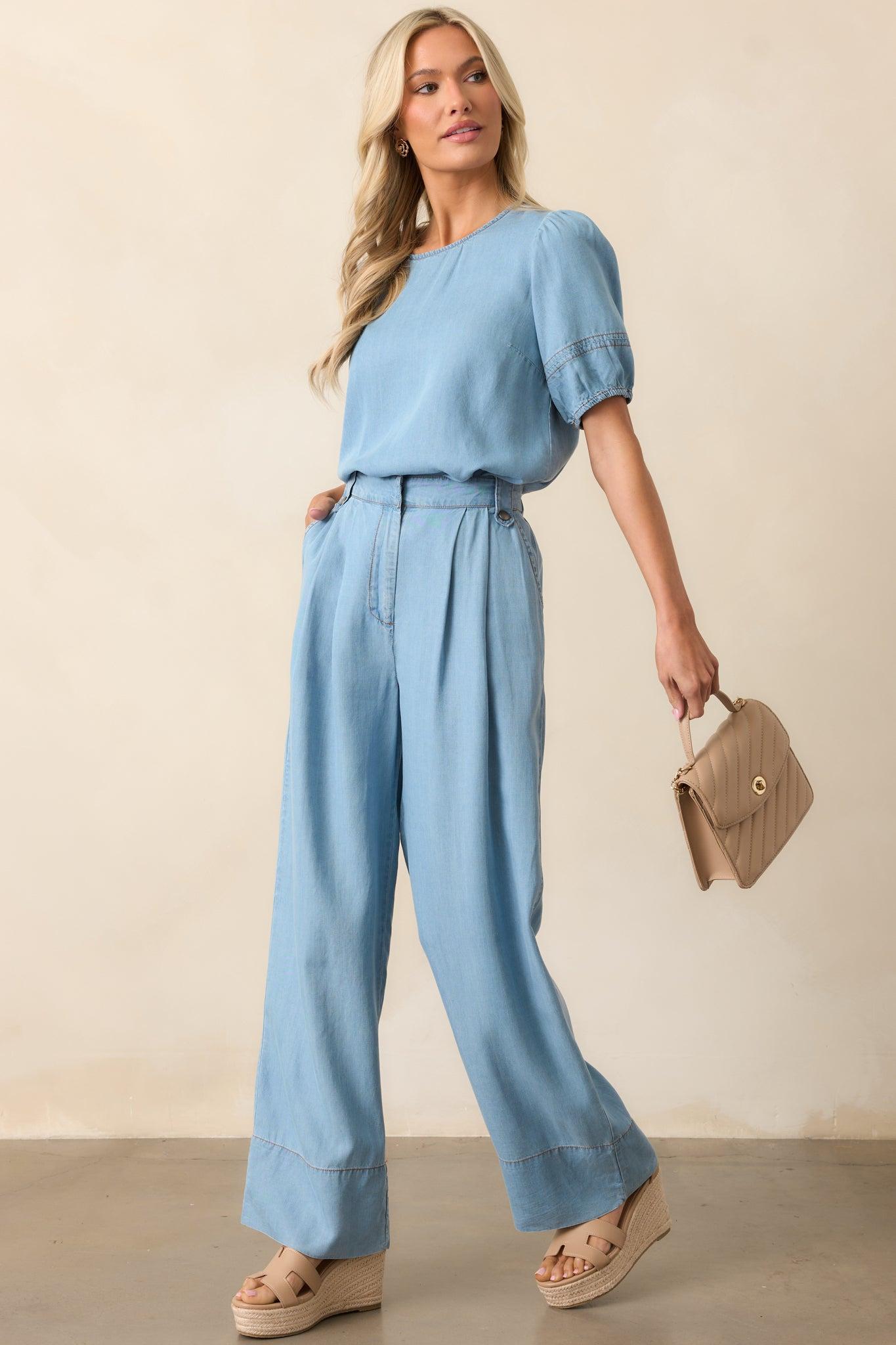 The At A Moments Notice Blue Chambray Tailored Pants are a versatile choice for embracing a polished yet effortless style. They're perfect for those moments when you want to feel put-together and ready to take on anything, whether it's a spontaneous outing or a planned event. These chambray pants feature a tailored-style design, hidden hook and bar closure, classic zipper, wide legs, back elastic waist insert, a high rise, and functional pockets.