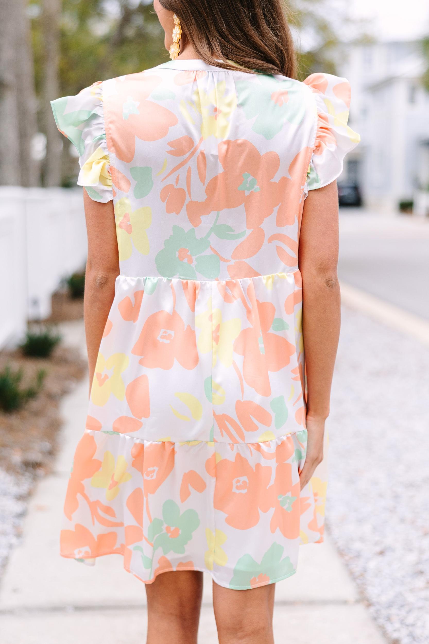 Bring a pop of spring style to any wardrobe with this At This Time Coral Orange Floral Dress. It's perfect for any warm weather occasion, with a cheerful pastel floral print and a cute, comfortable fit. Get ready to turn heads with this one-of-a-kind look. This dress features ruffled cap sleeves, a v-neckline, satin fabric, and a pastel floral print. Material has no amount of stretch.Sydney is wearing the small.