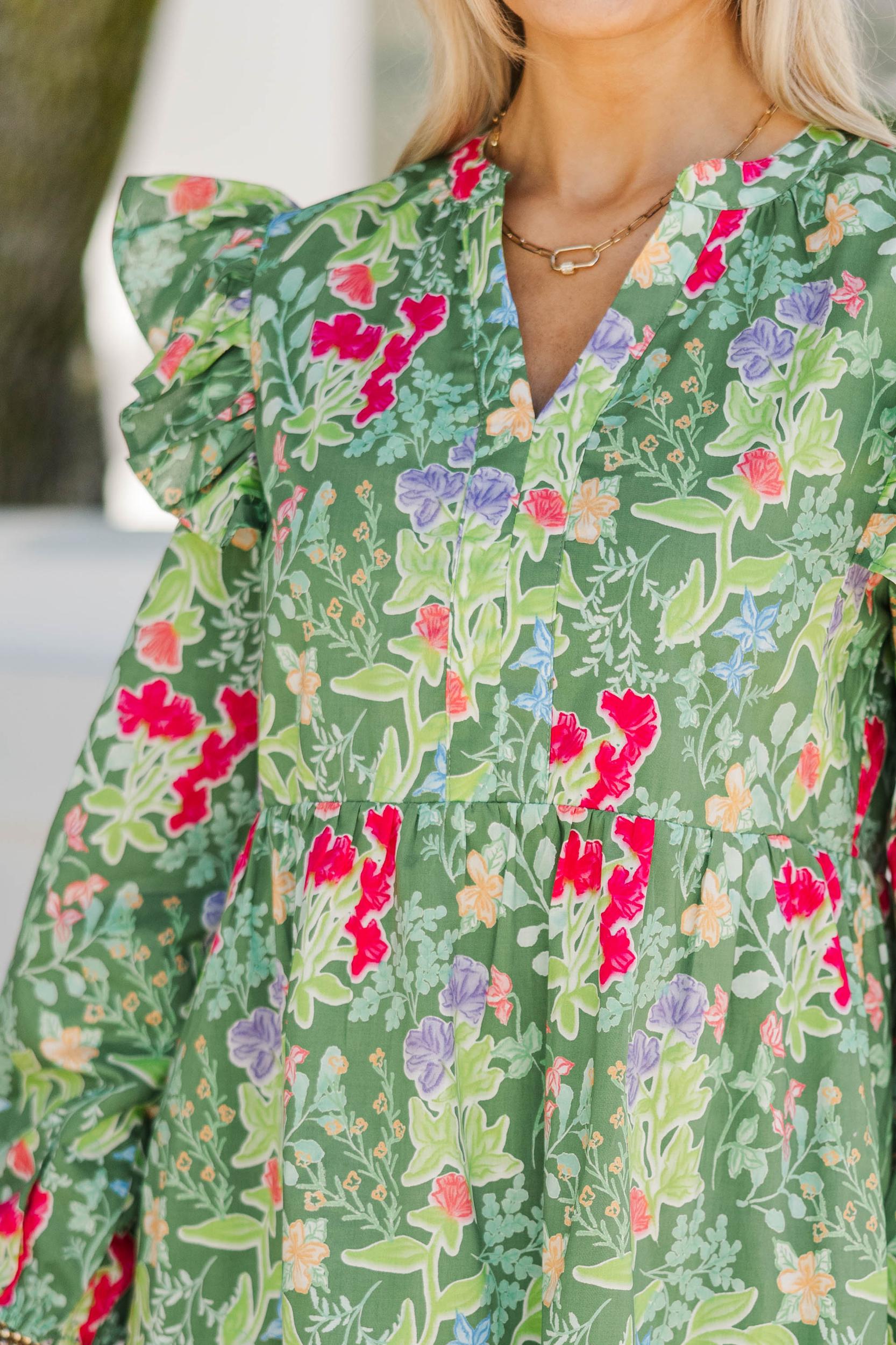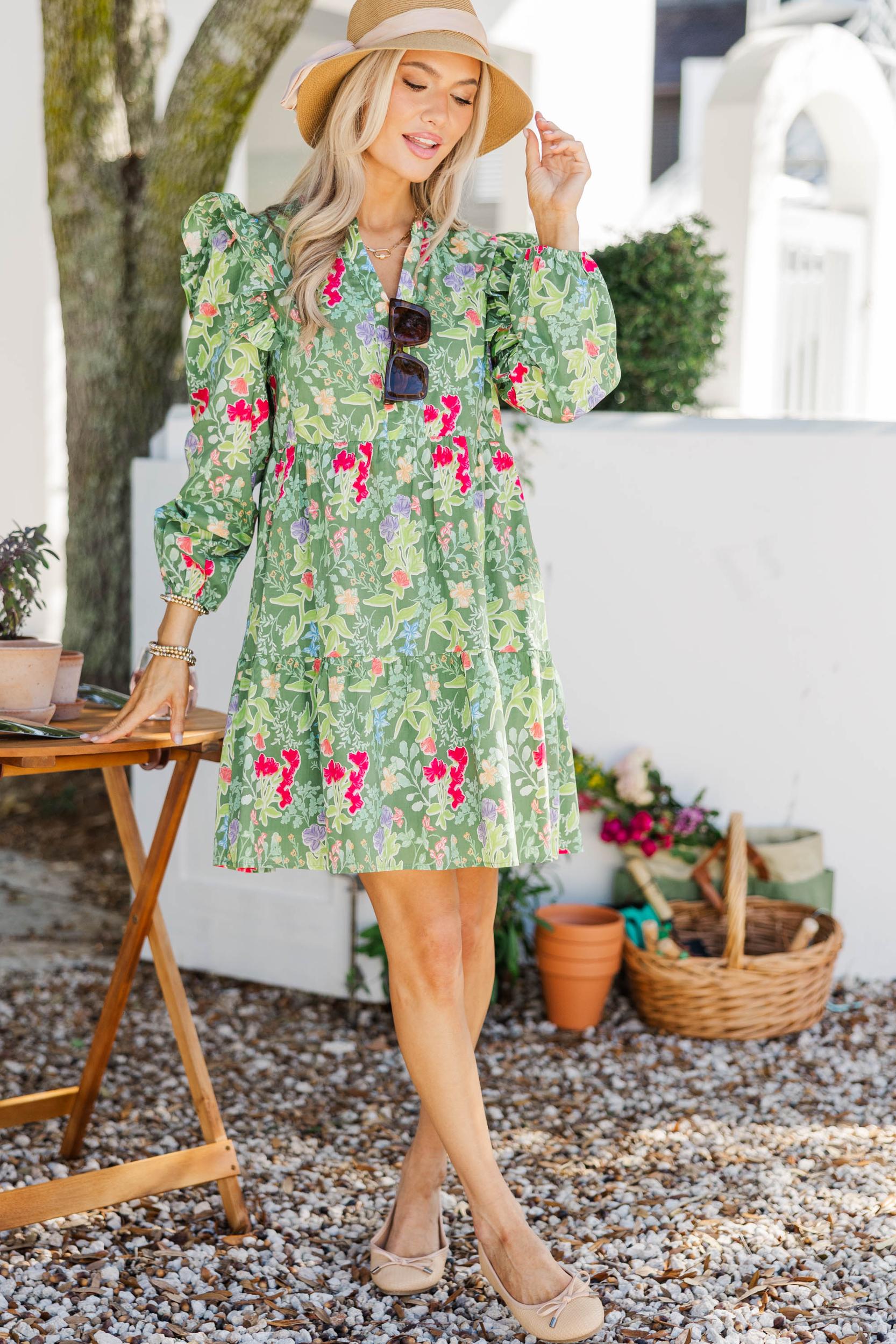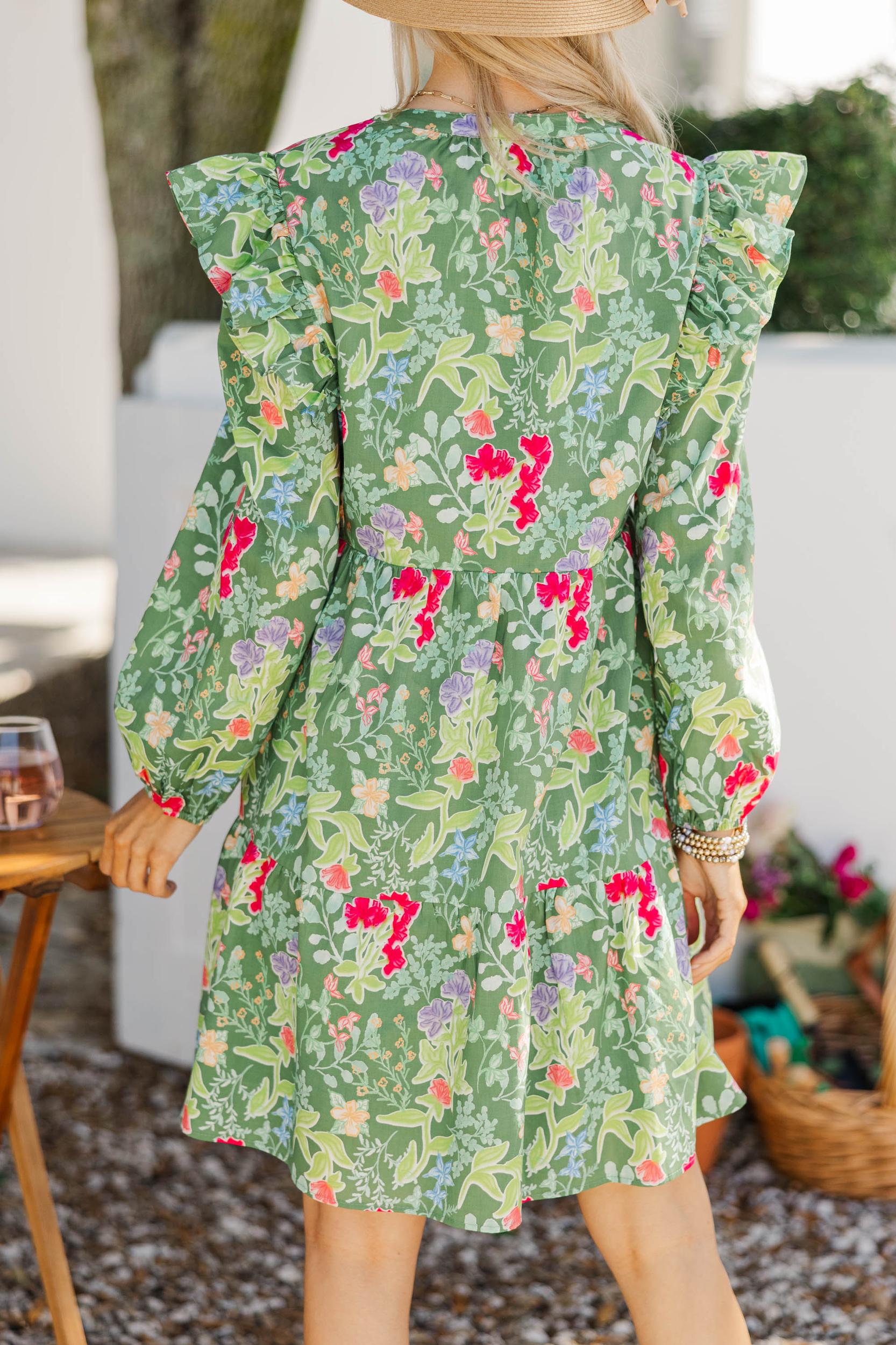 This dress is an easy favorite with its fresh floral print and effortlessly flattering silhouette. The lightweight fabric moves beautifully, making it perfect for sunny days, brunch plans, or casual celebrations. Sweet ruffle details add a feminine touch while keeping the look comfortable and wearable all day long. V-neckline Ruffled shoulder detail Relaxed, flowy fit Above-the-knee hemline No stretch Baileigh is wearing the small.