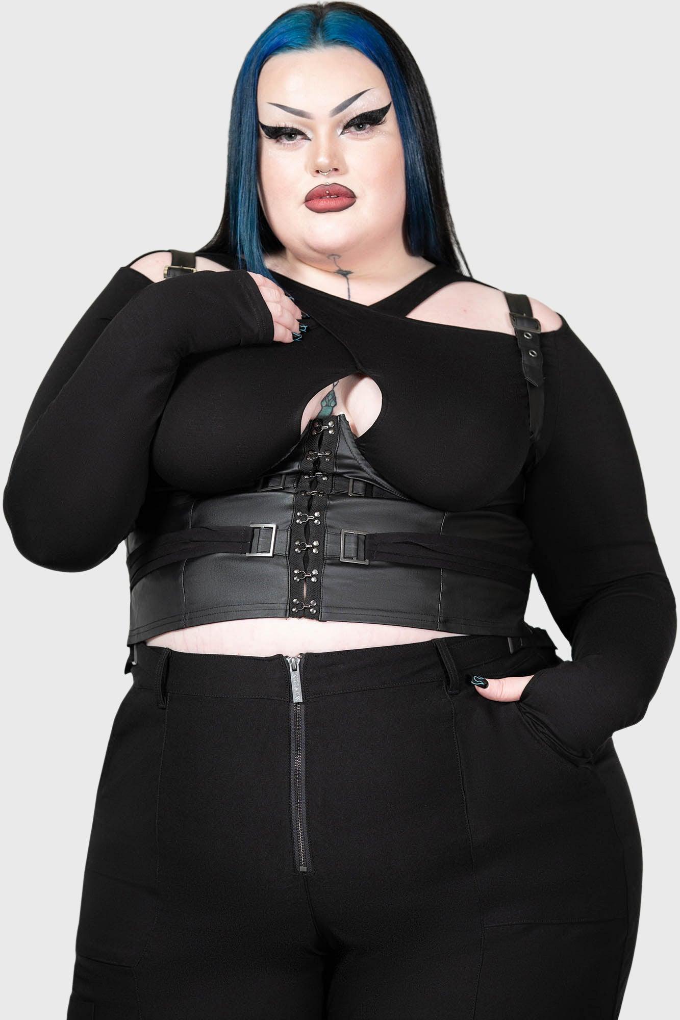 ATACAMA'S VOID.- Faux leather look fabric.- Boned underbust.- Gun-metal hardware.- Front hook and eye closure.- Bondage strap detailing.- Adjustable shoulder straps.- Fitted.With KILLSTAR branding, 93% Polyester 7% Elastane.Machine wash cold (30°c) / Do not bleach / Do not tumble dry / Iron at low temperature / Do not dry clean. Imported.