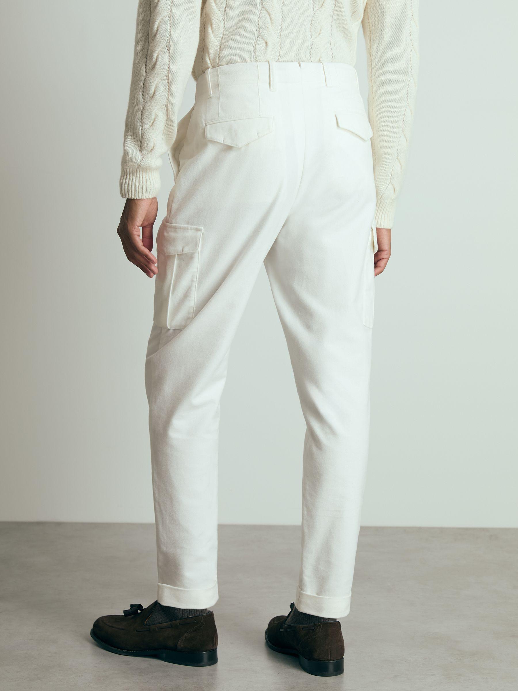 The utilitarian air of the Lato trousers is elevated by a rendering in soft cotton moleskin. Shaped with a deep rise and tapered legs, they’re patched with box-pleated cargo pockets, then finessed with an after-dinner split at the back of the waistband — a detail inspired by the elegant tailoring of Savile Row. 100% cotton Belt-looped waistband Slip pockets Box-pleated cargo pockets Turn-up cuffs After-dinner split Jetted back pockets Concealed front zip Hook and bar fastening Reiss Atelier is an effortlessly modern collection of timeless wardrobe staples and occasion styles using the finest fabrics and tailoring techniques.