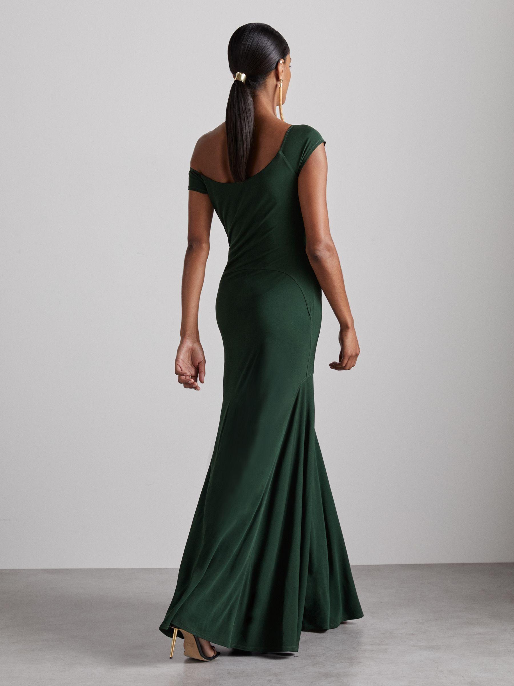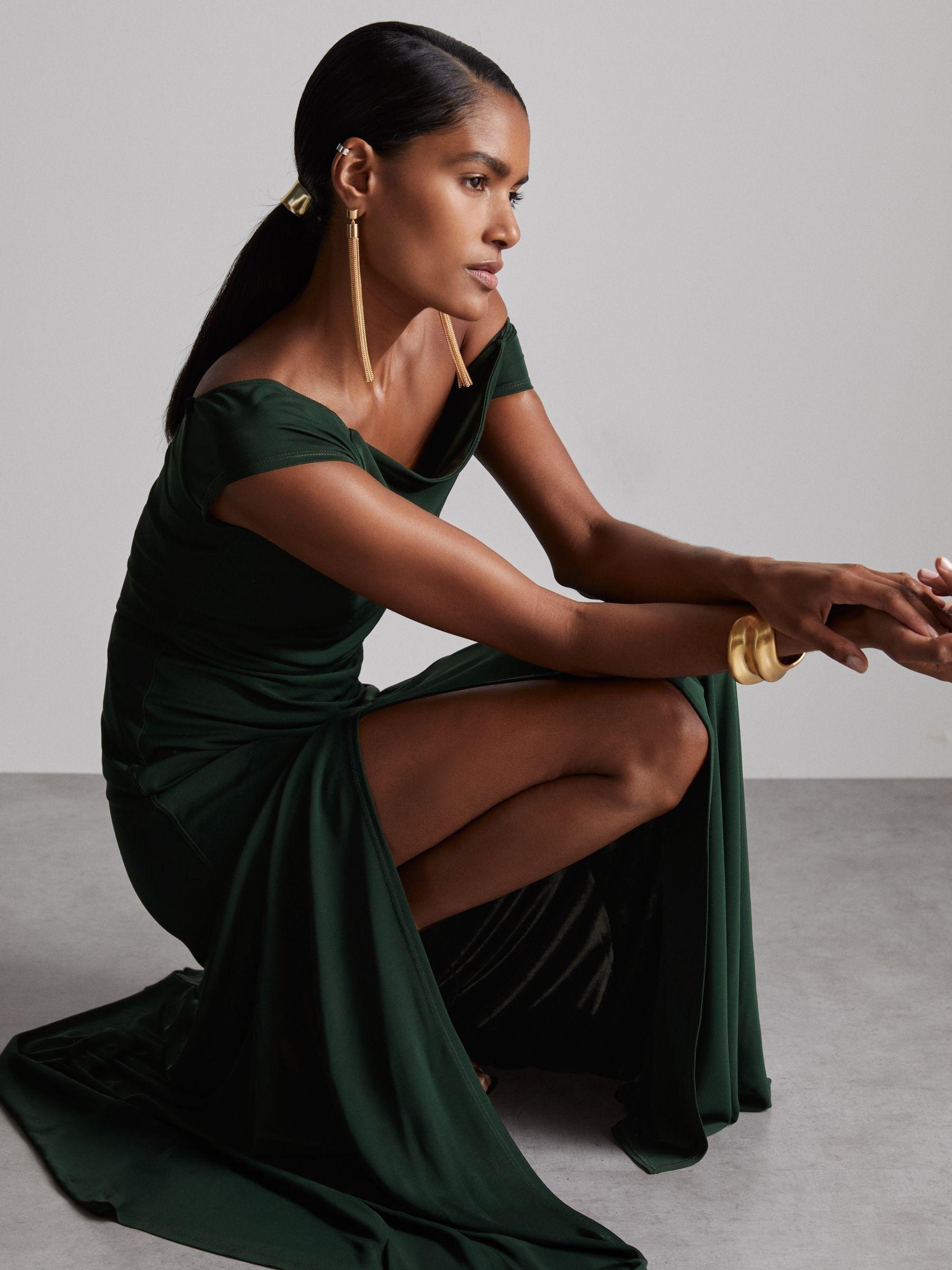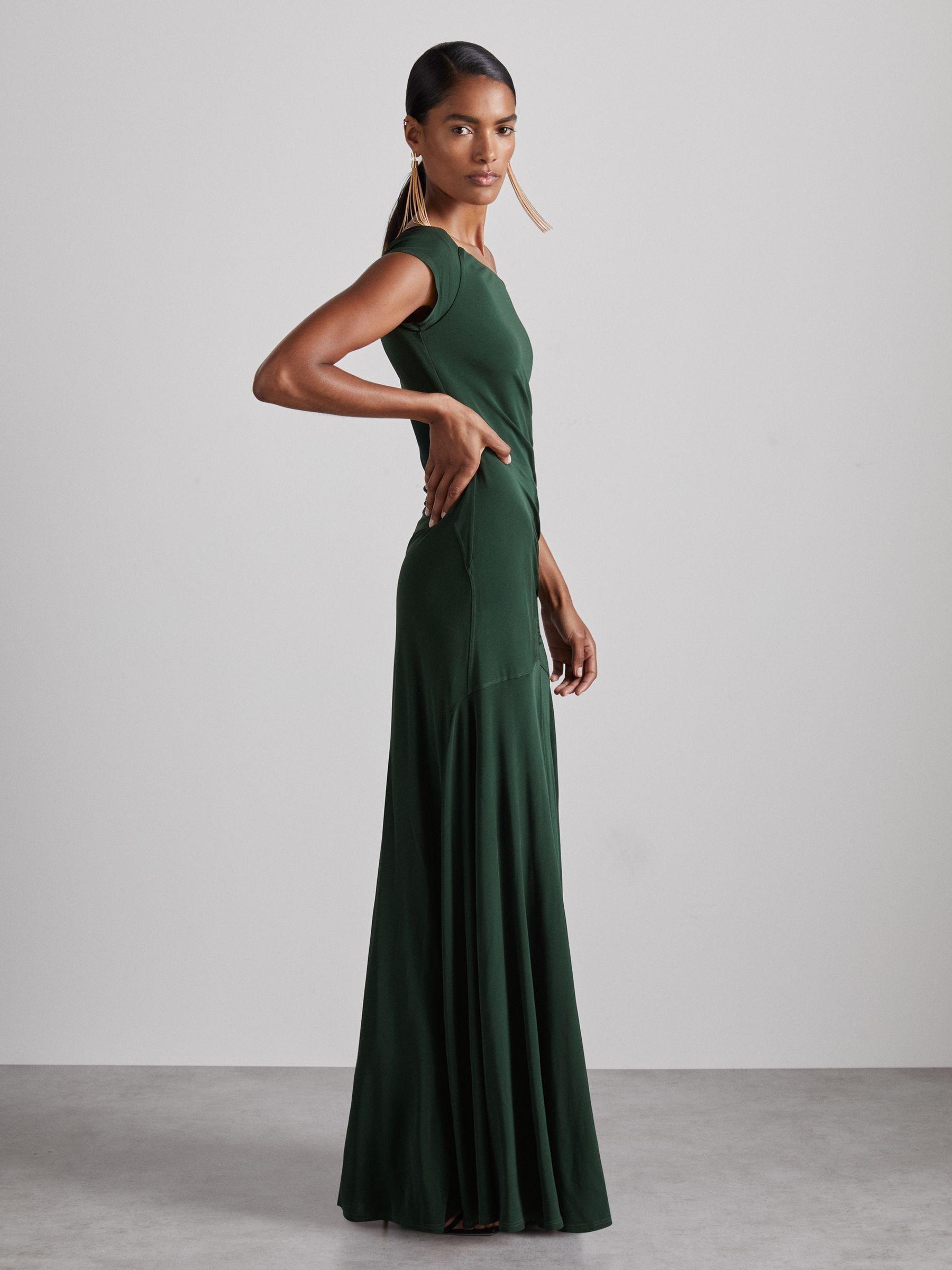 There’s a 1920s nuance to the Elliotte dress, which skims the frame before falling into a dropped waistline and floor-sweeping hem. Crafted from fluid crepe-inspired jersey with a boat neckline, it has asymmetric gathers bounded by a ruffle and a thigh-grazing front slit — ideal for framing statement sandals. Mid-weight jersey. Boat neckline. Cap sleeves. Front gathers and ruffle. Dropped waist. Flared floor-length hem. Front slit. Reiss Atelier is an effortlessly chic collection of timeless wardrobe staples and occasion pieces that can be worn - and loved - for many years. The model is wearing a size 8. Measurements of model: Height 5 10" / 177.8cm.