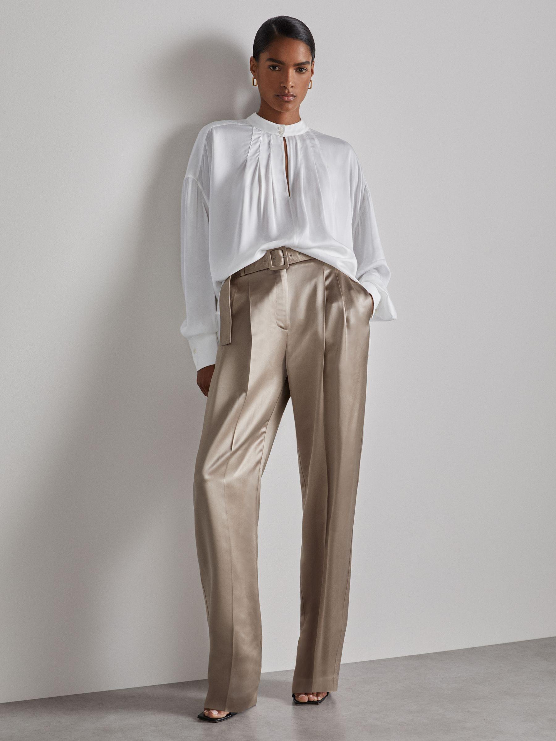 The Noemie top is crafted with a band collar that’s frame by an elegant keyhole and tucks that release fullness into the piece. Rendered in floaty faille, it’s accented with drop-shoulder sleeves then pleated at the yoke and French cuffs. Lightweight faille. Buttoned band collar. Tucked keyhole neckline. Drop-shoulder sleeves. Pleated French cuffs. Pleated yoke Reiss Atelier is an effortlessly chic collection of timeless wardrobe staples and occasion pieces that can be worn and loved for many years. Measurements of model: Height 5'10" / 177.8 cm. The model is wearing a size 8.