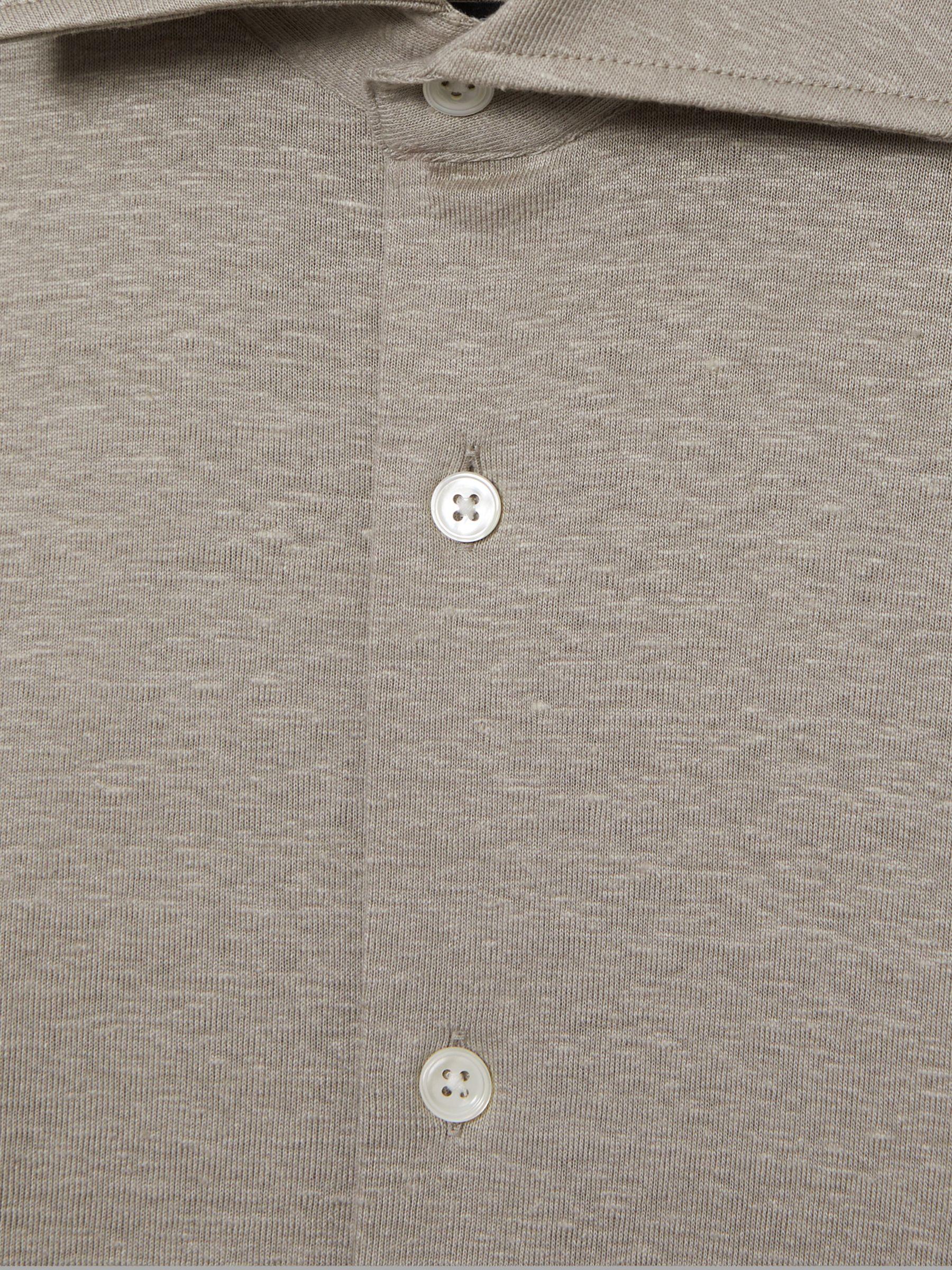The breathable linen of the Brescia shirt is blended with a hint of stretch to accentuate its natural comfortability. Shaped with a flattering spread collar, it has a curved hem and buttoned French placket. Stretch-linen jersey. Spread collar. Curved hem. Buttoned French placket. Reiss Atelier is an effortlessly modern collection of timeless wardrobe staples and occasion styles using the finest fabrics and tailoring techniques. Measurements of model: 6ft2” / 189cm. The model is wearing a size M.