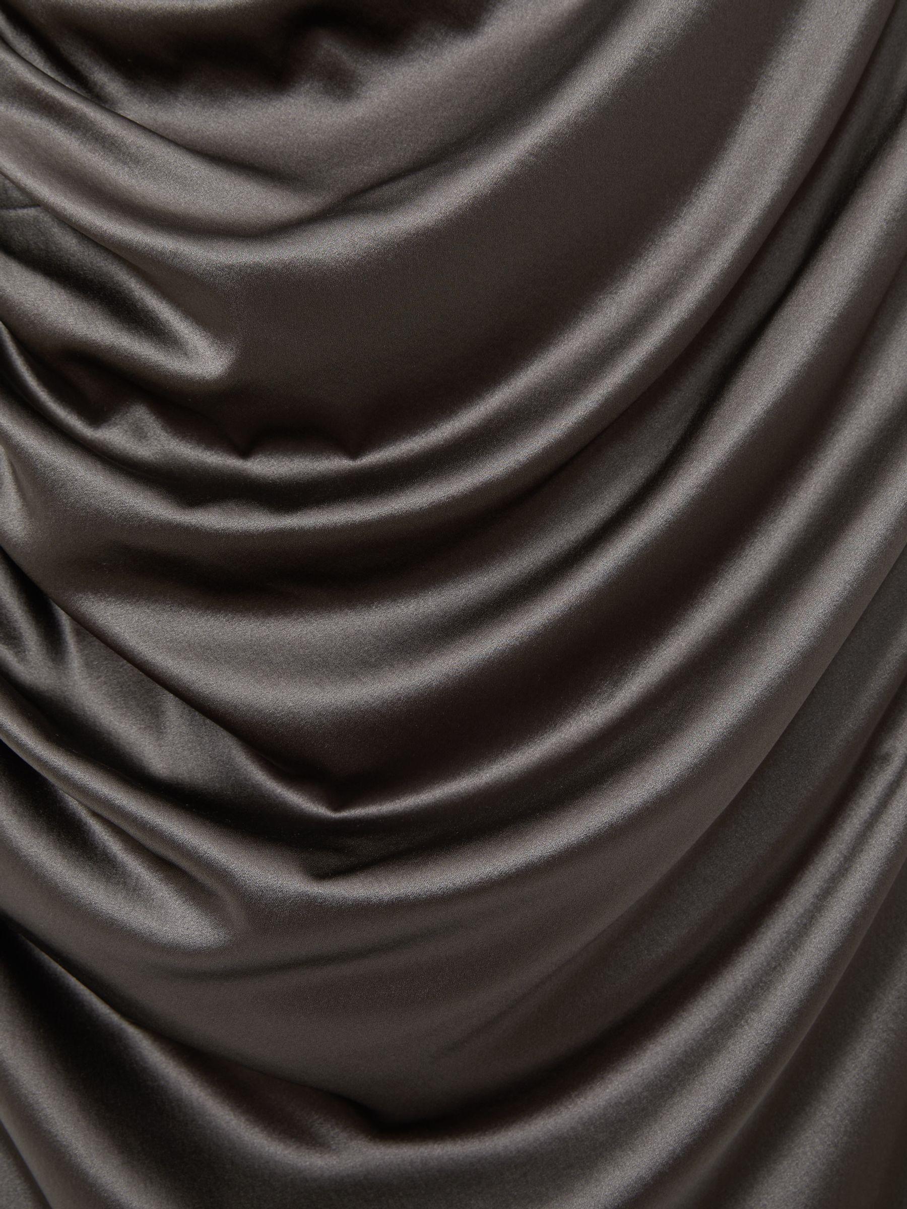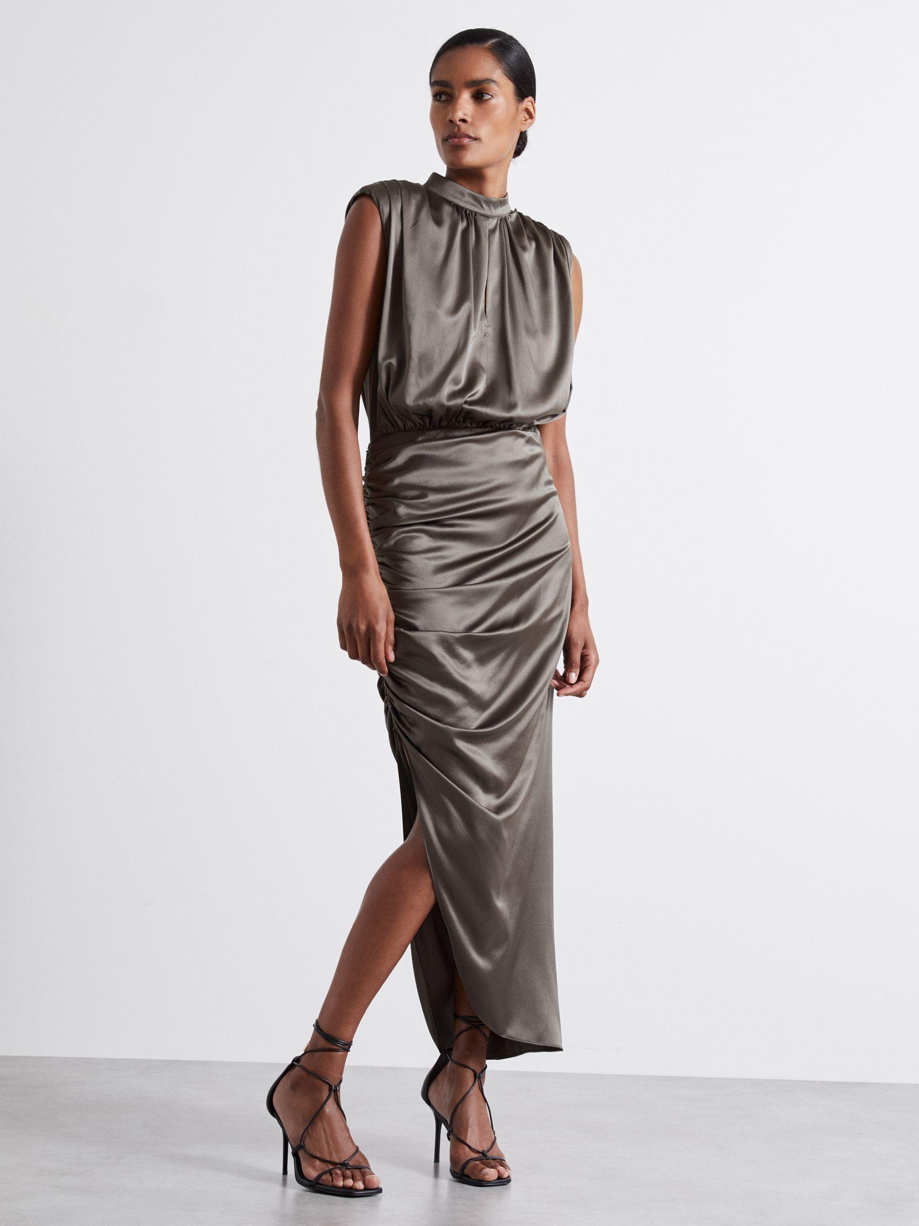 Crafted from silk-blend satin with light-catching ruches and a keyhole neckline, the Aude dress exudes a contemporary air. Frame the asymmetric hem to maximum effect with towering sandals. Silk-blend satin. Round keyhole neckline. Padded shoulders. Asymmetric ruches and hem. Mini-length lining. Concealed nape buttons.